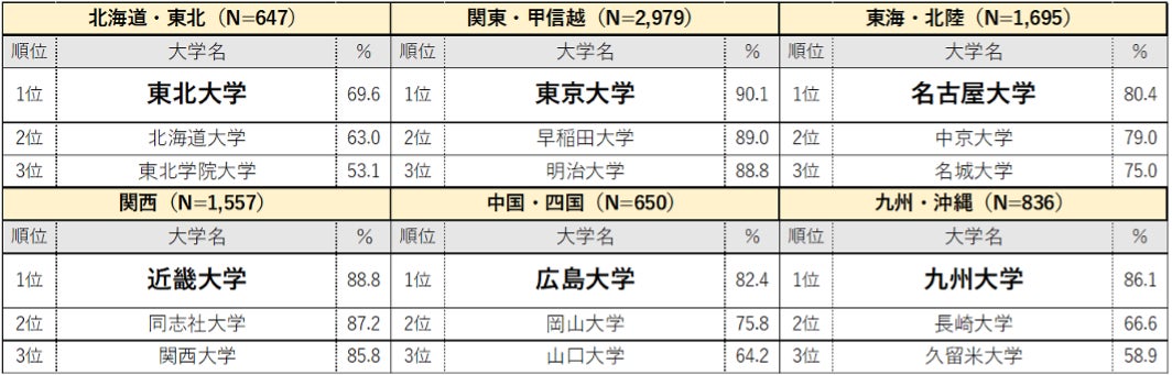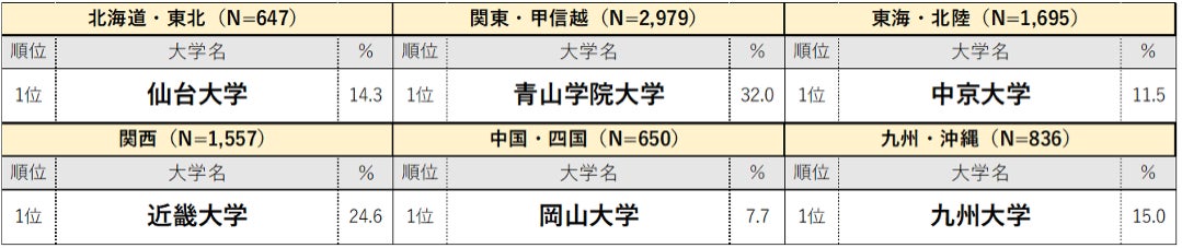 全国の大学認知度ランキングでは、関西を除く各エリアで、国立大学が認知度ランキング1位を獲得する結果となった。一方、関西では私立大学である近畿大学が1位を獲得した。