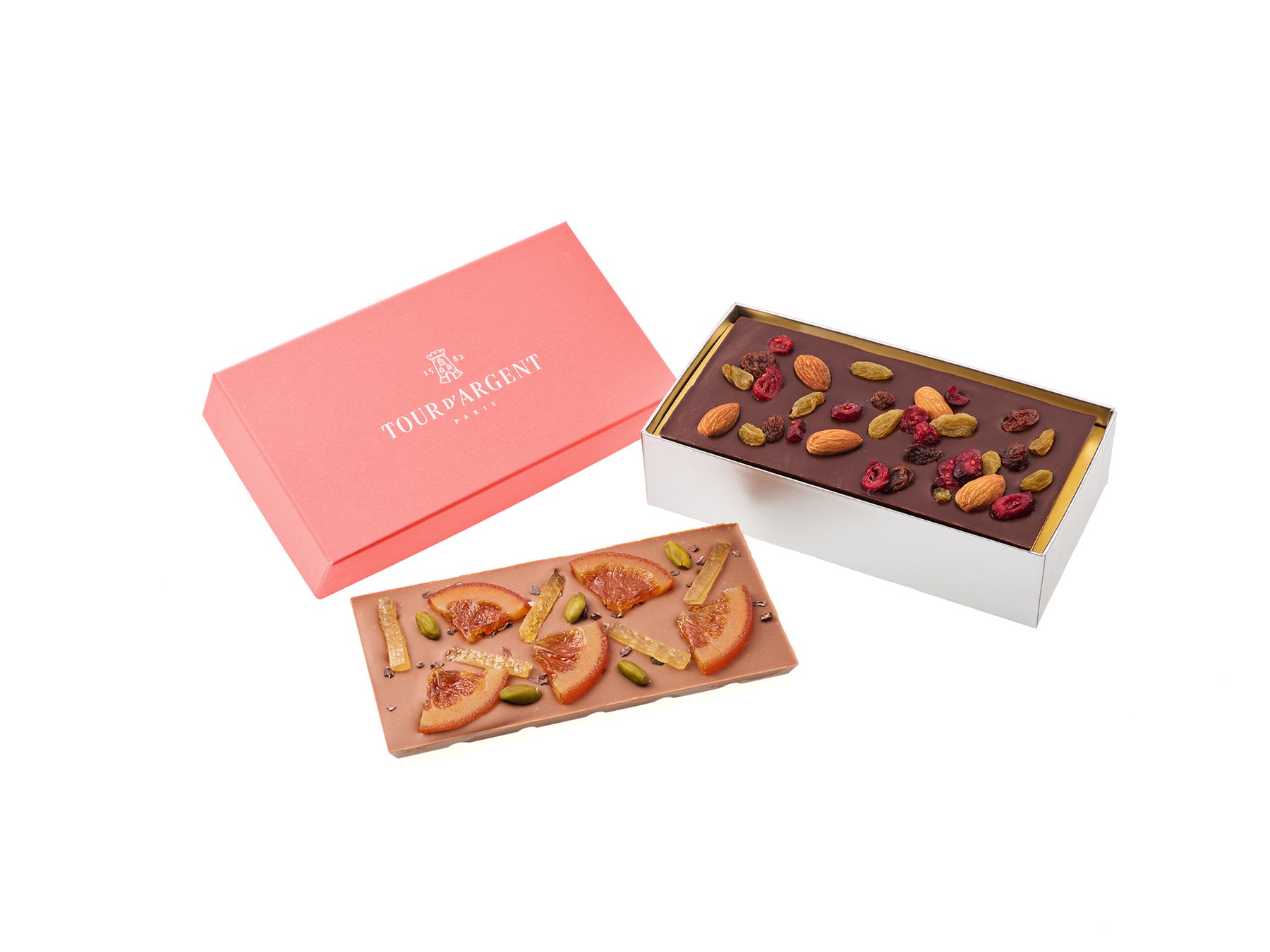 ロゴをあしらったショコラは、ヘーゼルナッツのプラリネ。アプリコットとローズマリーを効かせたミルクチョコレートと、ブラックベリーとジャスミンを効かせたブラックチョコレートの5個入り。フランス語で"宝石"を意味する"ビジュー"は言葉通り、宝石のごとく輝くショコラです。