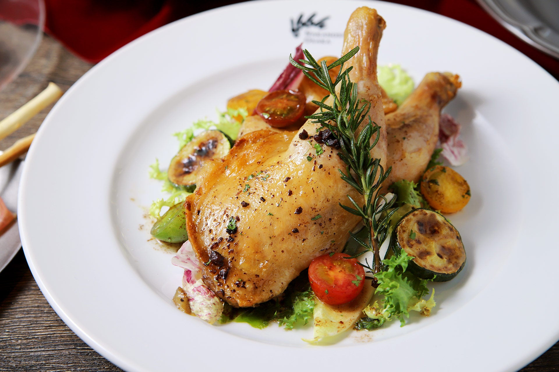 ◎骨付き鶏もも肉のコンフィ季節野菜のサラダ仕立て