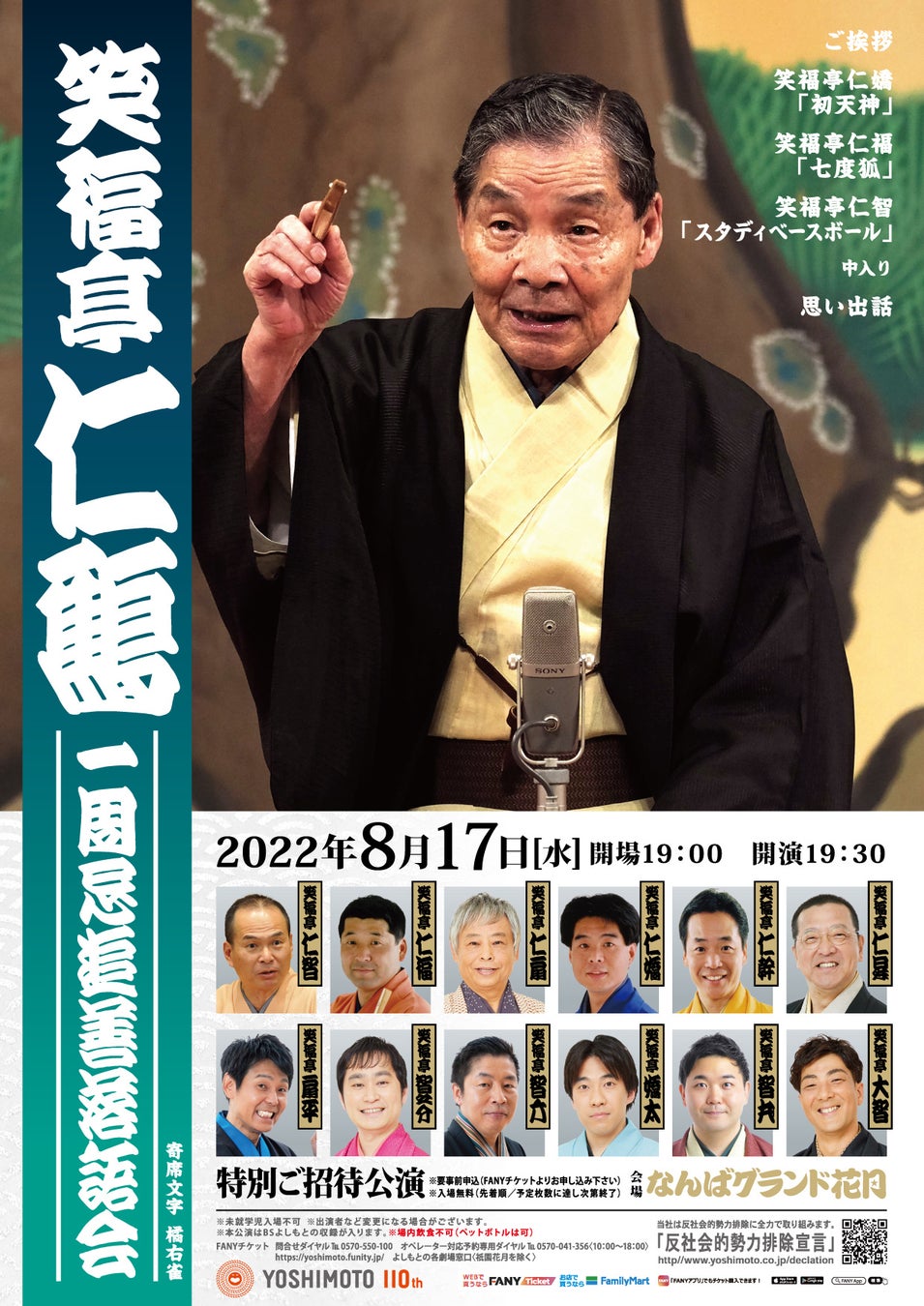 「笑福亭仁鶴一周忌追善落語会」 8月27日(土) 12:00~14:30