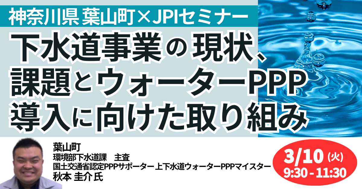 JPI(日本計画研究所)は、葉山町 環境部下水道課 主査 国土交通省認定PPPサポーター 上下水道ウォーターPPPマイスター 秋本 圭介 氏を招聘し、神奈川県葉山町における下水道事業の現状、課題とウォーターPPP導入に向けた取り組みについて詳説いただくセミナーを開催します。