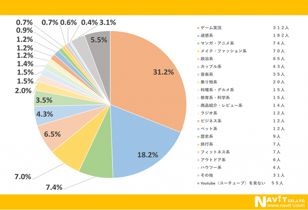普段見ない動画のジャンルについてたずねたアンケートで一番多かったのは「ゲーム実況」が31.2%で約1/3でした。次が「迷惑系」で18.2%です。ゲーム実況と迷惑系という、全く違うジャンルが上位に入っています。