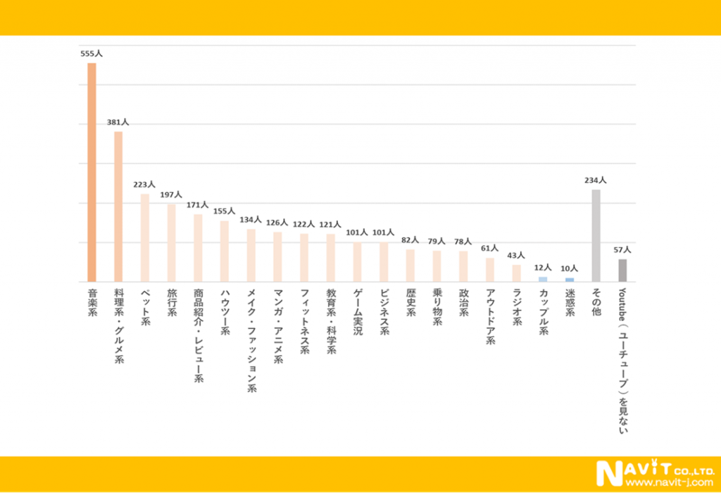 筆者はYoutubeをあまり視聴しないので、フリー回答で知っている名前がほとんど無かったのですが、料理系やHow to系の動画が多く選ばれていたような印象でした。また芸能人の名前も多くあがっていました。