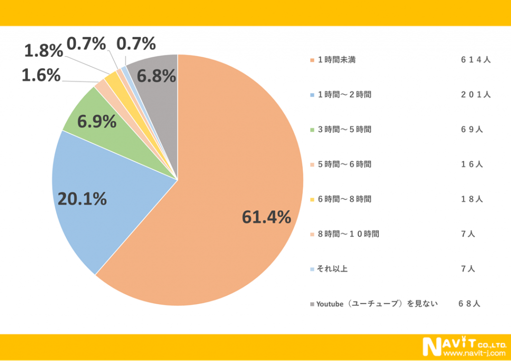テレビ離れと言われている昨今ですが、テレビのかわりになるYoutubeは、いったいどれ位の時間視聴されているのでしょうか。一番多かったのは「1時間未満」で61.4%で次に多かったのは「1時間〜2時間」という結果になりました。
