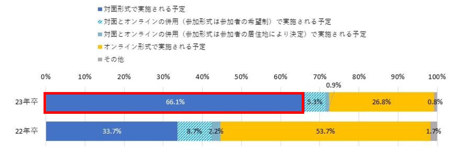 - 内定式の実施方法は「対面形式」が66.1%と最多で「オンライン形式」を大幅に上回る【図3】