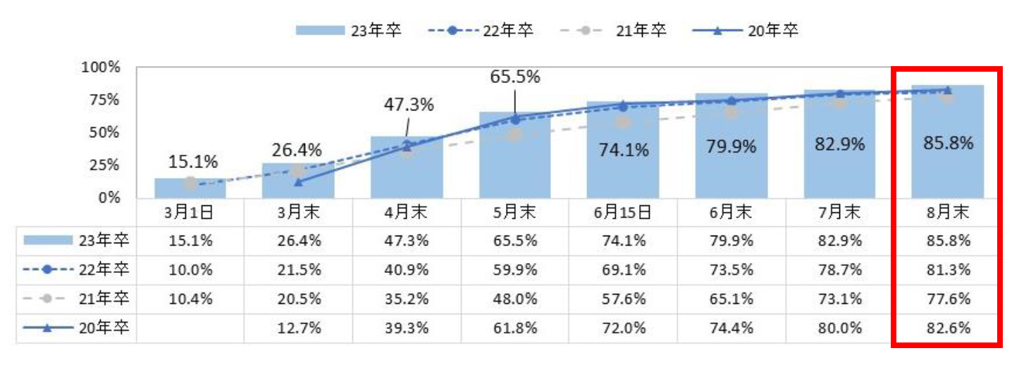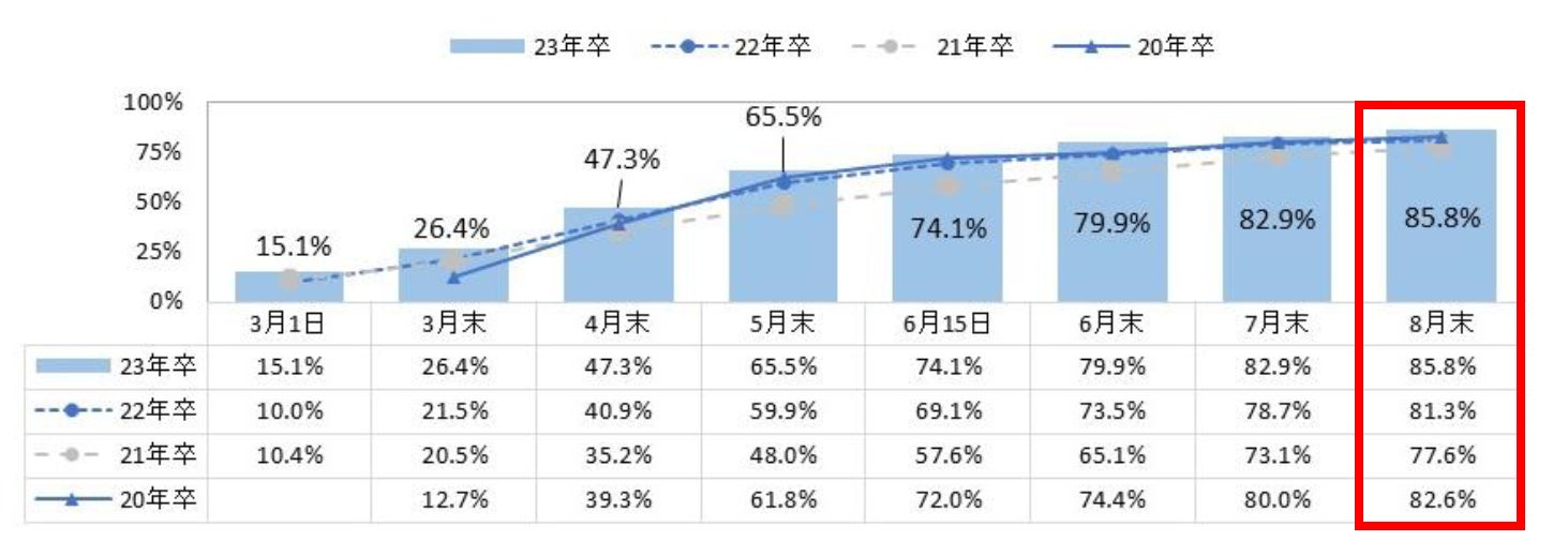 - 2023年卒業予定の大学生・大学院生の8月末時点での内々定率は前年比4.5pt増の85.8%。現行の採用スケジュールとなって以降過去最高【図1、2】