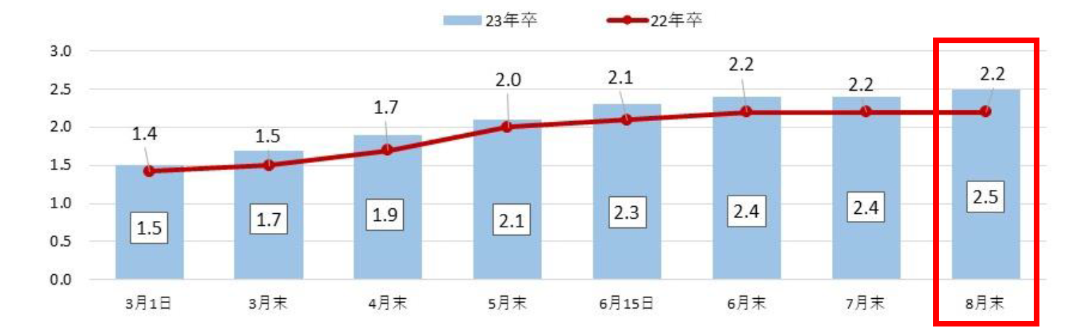 2023年卒業予定の大学生・大学院生の8月末時点での内々定率は前年比4.5pt増の85.8%、平均内々定保有社数は前年比0.3社増の2.5社だった。企業の採用意欲の高まりを受け、7月に引き続き、内々定率・平均内々定保有社数ともに前年比増で推移しており、内々定率は現行のスケジュールになって以降(2017年卒~)過去最高の数値となった。【図1、2】