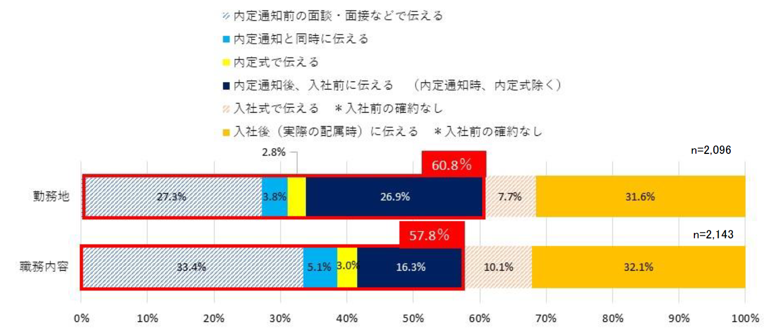 「入社後の配属をどの時点で知りたいと思うか」という質問に対し、入社前に知りたいと思う学生は86.0%だった(「内定通知前の面談・面接」「内定通知と同時」「内定式」「内定通知後から入社前まで(内定通知時、内定式は除く)」の合計)。企業調査によると「入社前」に配属先を告知する割合は「勤務地の通知」が60.8%、「職務内容の通知」が57.8%と、学生の希望するタイミングと実際の企業が通知するタイミングにギャップが生じていることが分かる。特に、「内定通知と同時」(15.5%)、「内定式」(15.4%)は企業が実際に実施するタイミングとギャップが大きく、学生は入社後の自身の働く環境について早めに知りたいというニーズがあるようだ。【図4、5】