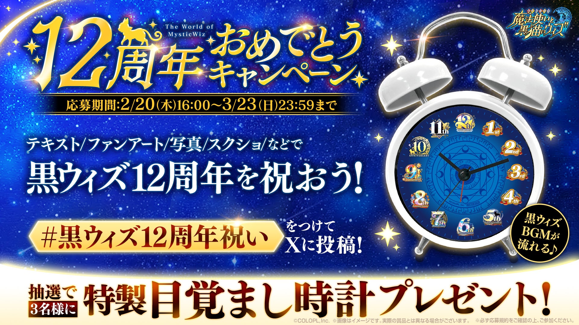 『黒猫のウィズ』公式Xをフォローの上、指定のハッシュタグをつけて、テキスト・ファンアート・写真・スクリーンショット等を投稿して下さった方の中から、抽選で3名様に「特製目覚まし時計」をプレゼントするキャンペーンを開催しております。