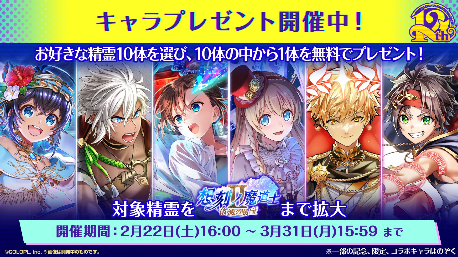 お好きな精霊を10体選び、10体の中から1体を無料でプレゼントいたします。最大3回分の権利をプレゼントいたします。有料の「キャラプレゼントPREMIUM」も2回分ご用意しております。期間や対象精霊などの詳細はゲーム内をご確認ください。