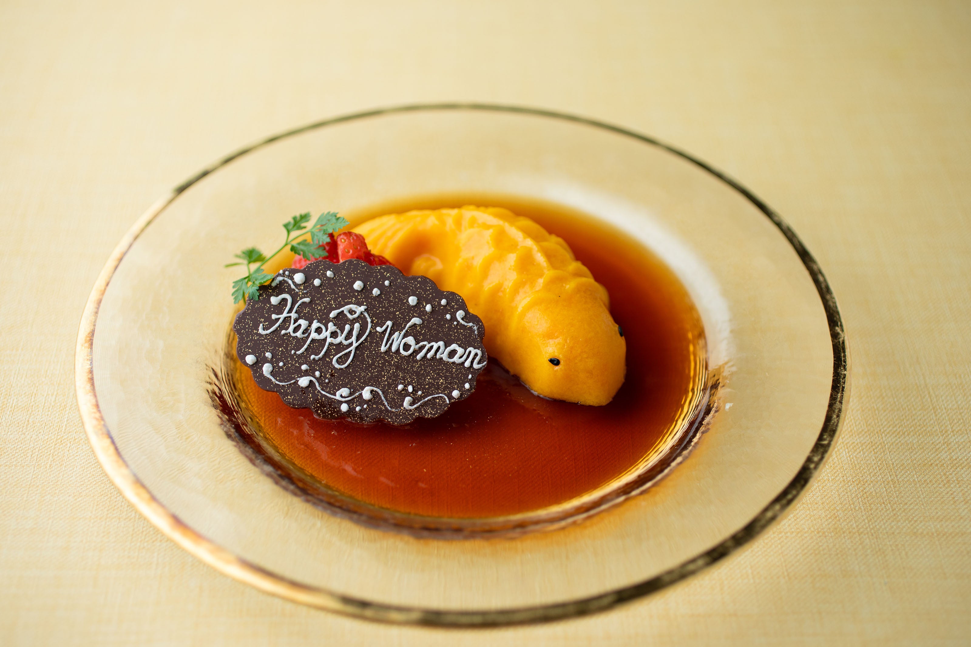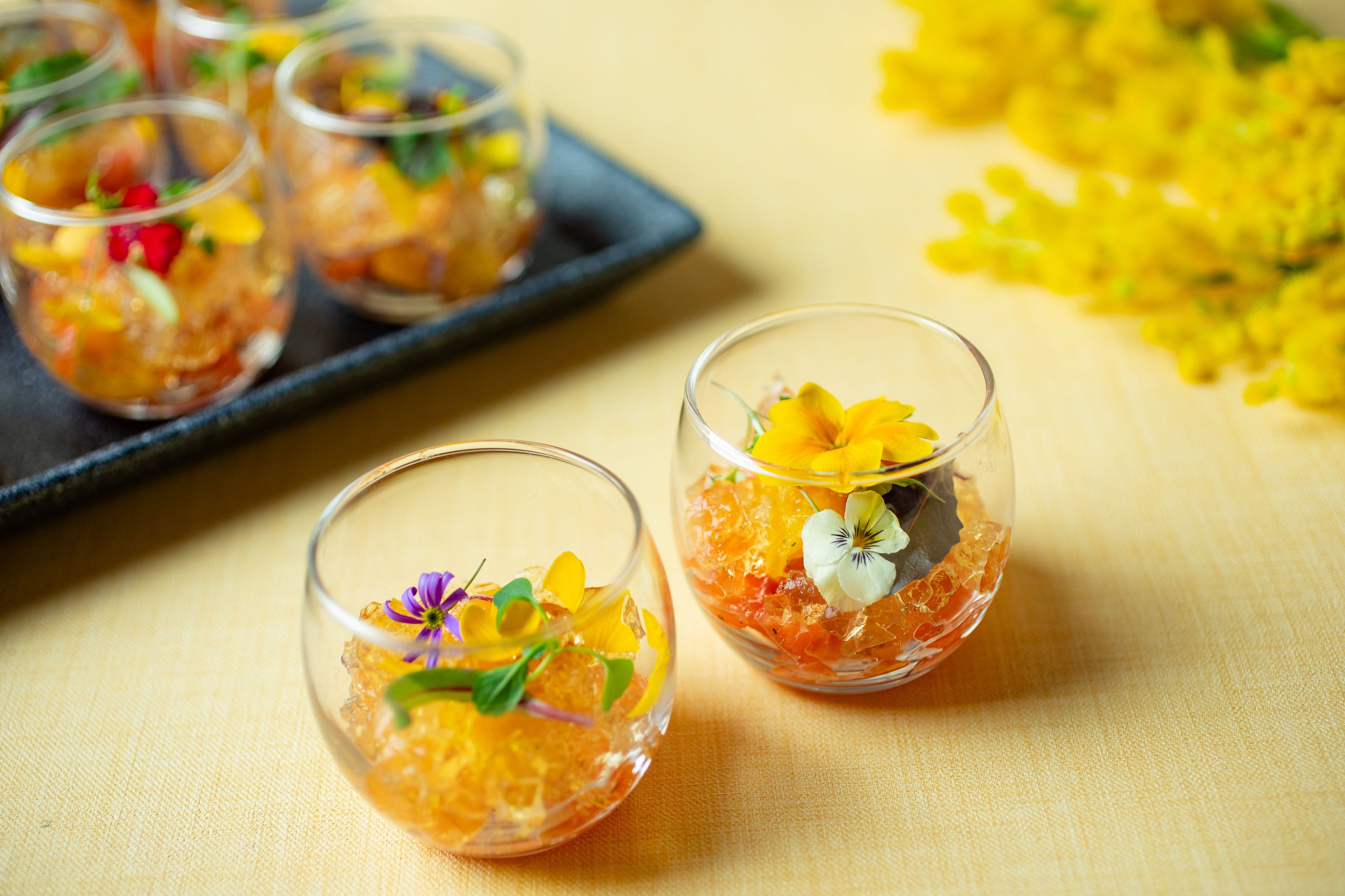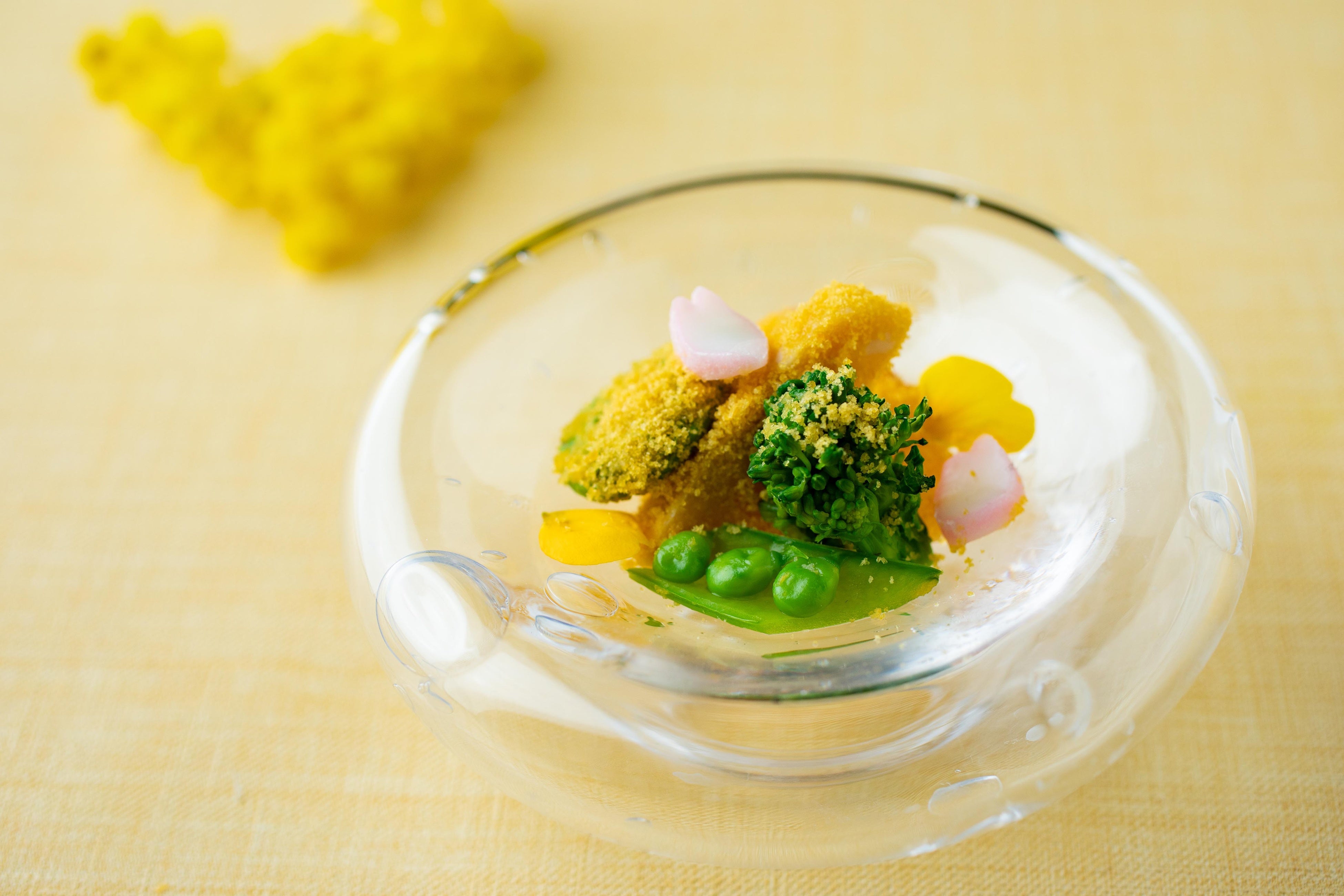 春に旬を迎える春素材をふんだんに用い、黄色が華やかな会席料理を作りました。蕗の薹や菜の花をはじめとする春野菜や愛らしい花野菜、鰆などの食材に鮮やかな黄色をかけ合わせた特別な会席で、国際女性デーをお祝いします。