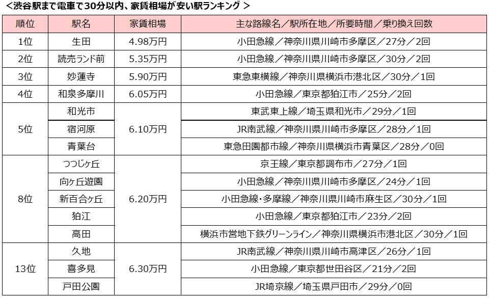 渋谷駅まで電車で30分以内、家賃相場が安い駅ランキング 1位は学生街に位置する「生田駅」!川崎市の駅が6駅ランクイン
