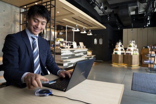 利用できるのは、ワイヤレス給電規格Qi(チー)対応のスマートフォンで、バッテリーをチャージする際は、この薄い円形の充電台に置くだけ。しかも10W給電をサポートするスマートフォンなら比較的スムーズに充電することができ、電池残量がゼロでもすぐに使える状態に〝復旧〟することができる。