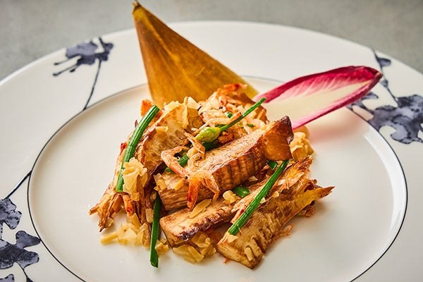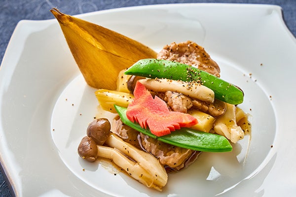 春を感じる素材を満喫でき、ふかひれ姿煮や北京ダックなど、高級食材もたっぷり使用した贅沢なコースです。香り高く柔らかい穂先筍をゆで卵と合わせ、シンプルに塩で味付けをした和え物や、ふっくらとした身と強い旨みを楽しめる旬の蛤と、コクのある紹興酒を使用した蒸し物などを、前菜でご用意いたします。春らしく桜の香りが楽しめるふかひれ姿煮は、厚みのあるふかひれを贅沢に一枚使用し、食べ応えのある一皿です。コリコリで脂の甘みが強いアカハタは、皮をパリッとするまで焼き上げる煎り焼きにしてご提供いたします。葱の香りと甘みを凝縮したソースと相性抜群な一品をご堪能ください。