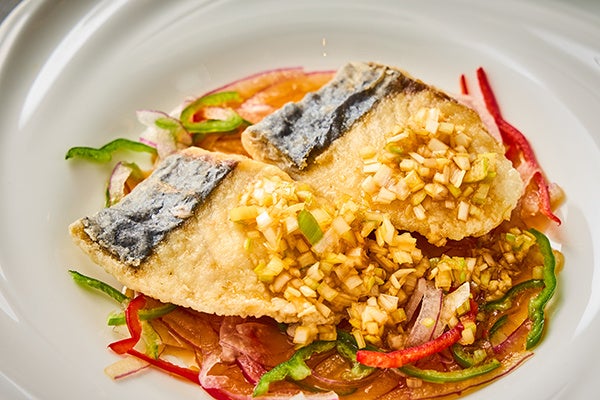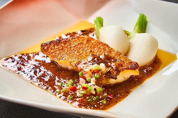 ◆赤ハタの煎り焼き 赤葱ソース 蕪を添えて