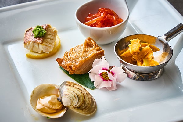 <穂先筍の塩卵和え/鶏肉の白腐乳焼き/メバルの青山椒ソースかけ/赤酢クラゲ/蛤紹興酒蒸し>