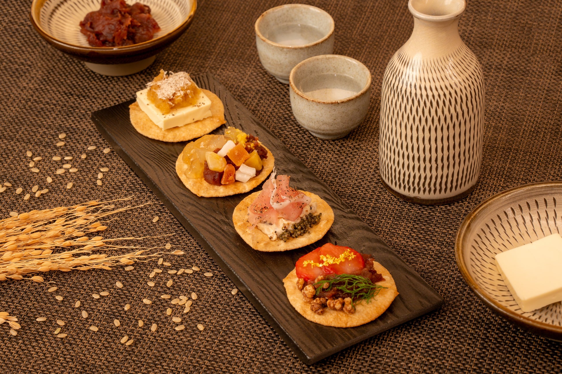 ライトアップされた棚田を眺めながらの「やつがい」では、大分県の日本酒「くにさき」や本格麦焼酎「とっぱい」を提供します。おつまみには、お米にちなんだ「せんべいディップ」を用意しました。クリームチーズやあんバターなどをせんべいにディップし、その上に大分名産の椎茸や梨などをトッピングして味わう、ユニークな一品です。ほのかに感じるお米の甘みとともに、大分らしい特別な宵のひとときを楽しめます。
