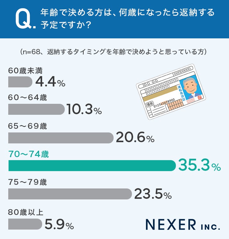 続いて、将来的に運転免許証の返納を「考えている」と回答した方に、どのタイミングで返納しようと思うかを聞いてみました。
