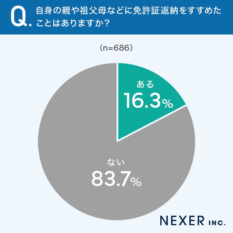 16.3%の方が、自身の親や祖父母などに免許証返納をすすめたことが「ある」と回答しています。