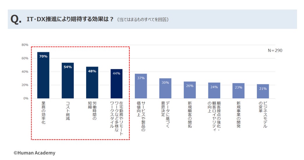 IT・DX推進によって期待する効果は、「業務の効率化」が70%で1位、「コスト削減」が54%で2位、「労働時間の短縮」が48%で3位、「在宅勤務やリモートワークなど多様なワークスタイル」が44%で4位となりました。多くの企業で、DXは業務効率化や働き方改善の手段として捉えられているようです。しかし、経済産業省は「DX推進指標」にて「DXは、本来、データやデジタル技術を使って、顧客視点で新たな価値を創出していくことである、そのために、ビジネスモデルや企業文化などの変革が求められる」と示しています。