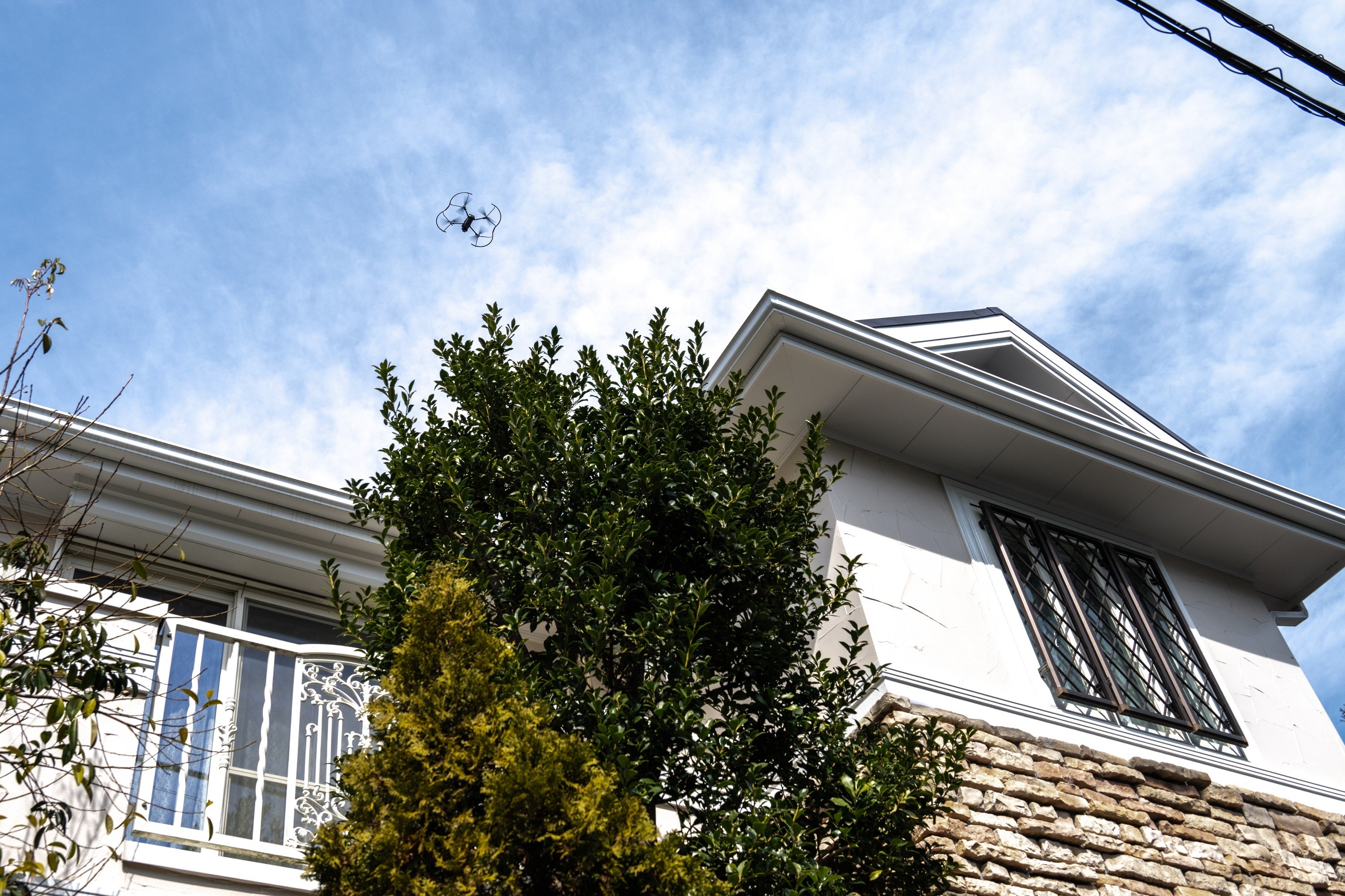 本実証実験は、東京都内の住宅地にて2022年3月7日(月)に実施しました。一般住宅に台風や雪災等による被害が起きたことを想定し、その屋根部上空にドローンを飛行させ、搭載されたカメラにより映像を撮影しました。映像は、5Gを活用したライブストリーミングにより、住宅地から離れたオフィスに転送され、鑑定人が映像を確認しながらリアルタイムで屋根部を鑑定しました。本取り組みは、楽天グループ内の各サービスを連携させて実現しており、具体的には、楽天の無人ソリューション事業部がドローンの操縦や飛行を、楽天損保が鑑定作業をそれぞれ担当していることに加えて、楽天モバイル株式会社(以下「楽天モバイル」)が5G環境ならびに技術知見を提供しています。