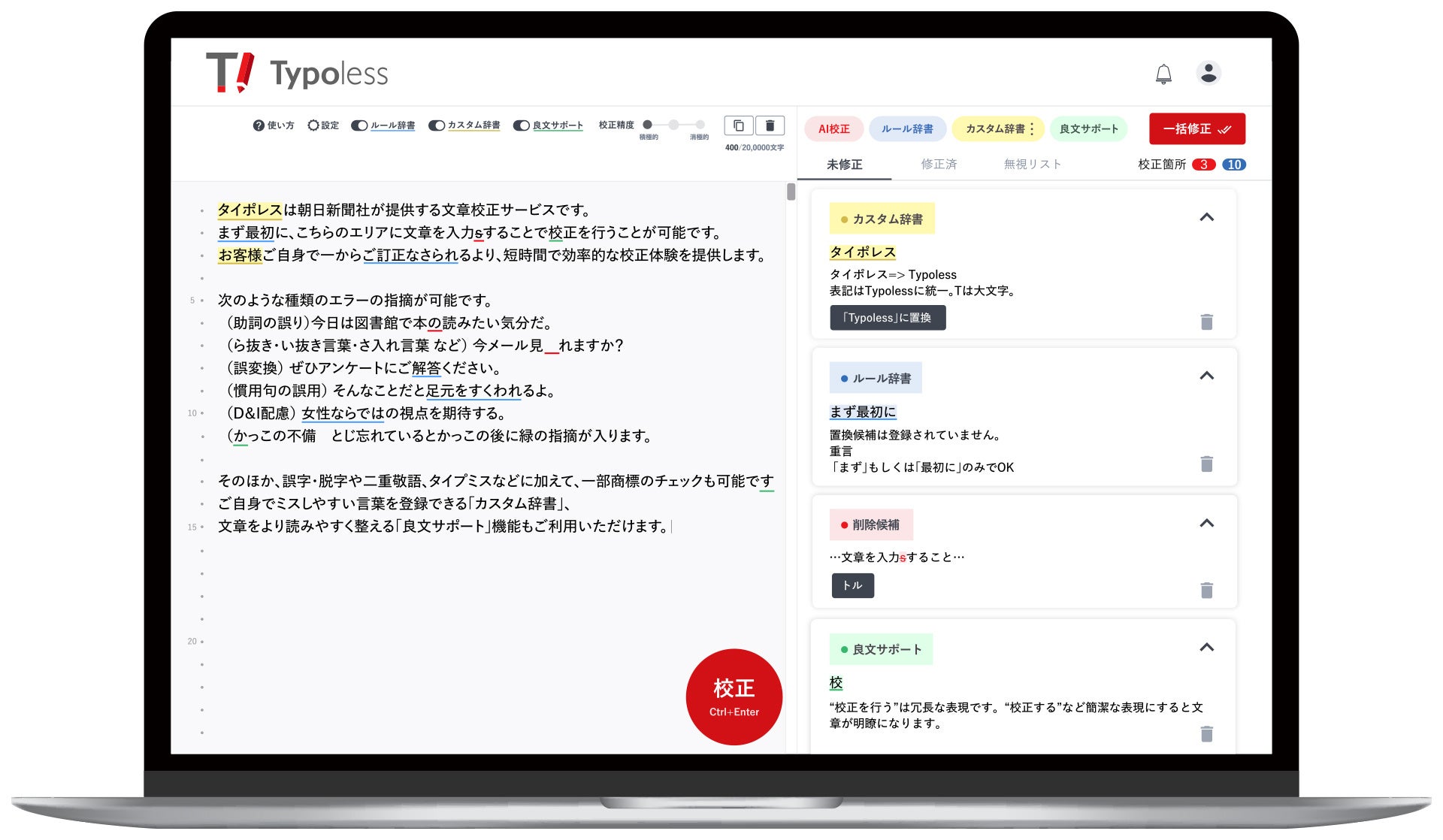 「Typoless」は、朝日新聞の過去40年間の記事データと膨大な校正履歴を学習させたAIに、約10万個の校閲ルール辞書の機能、ユーザーが独自に登録するカスタム辞書の機能を加えた校正ツールです。弊社内で自然言語処理などのAI研究を行う「メディア研究開発センター」が開発し、2023年10月にサービスを開始しました。個人向けプランのほか、API連携プランや法人向けエンタープライズプランを提供しています。個人向けプランとAPI連携プランは14日間、法人向けプランは30日間の無料トライアルが可能です。今年5月には文章をより読みやすく整える「良文サポート」機能を新たにリリースしました(プレミアム、エンタープライズプランのみ)。