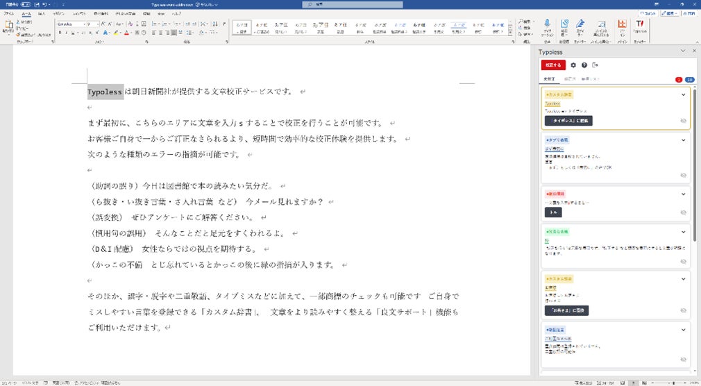 朝日新聞社の文章校正AI 「Typoless(タイポレス)」 がMicrosoft Wordアドインとして使えるようになりました。