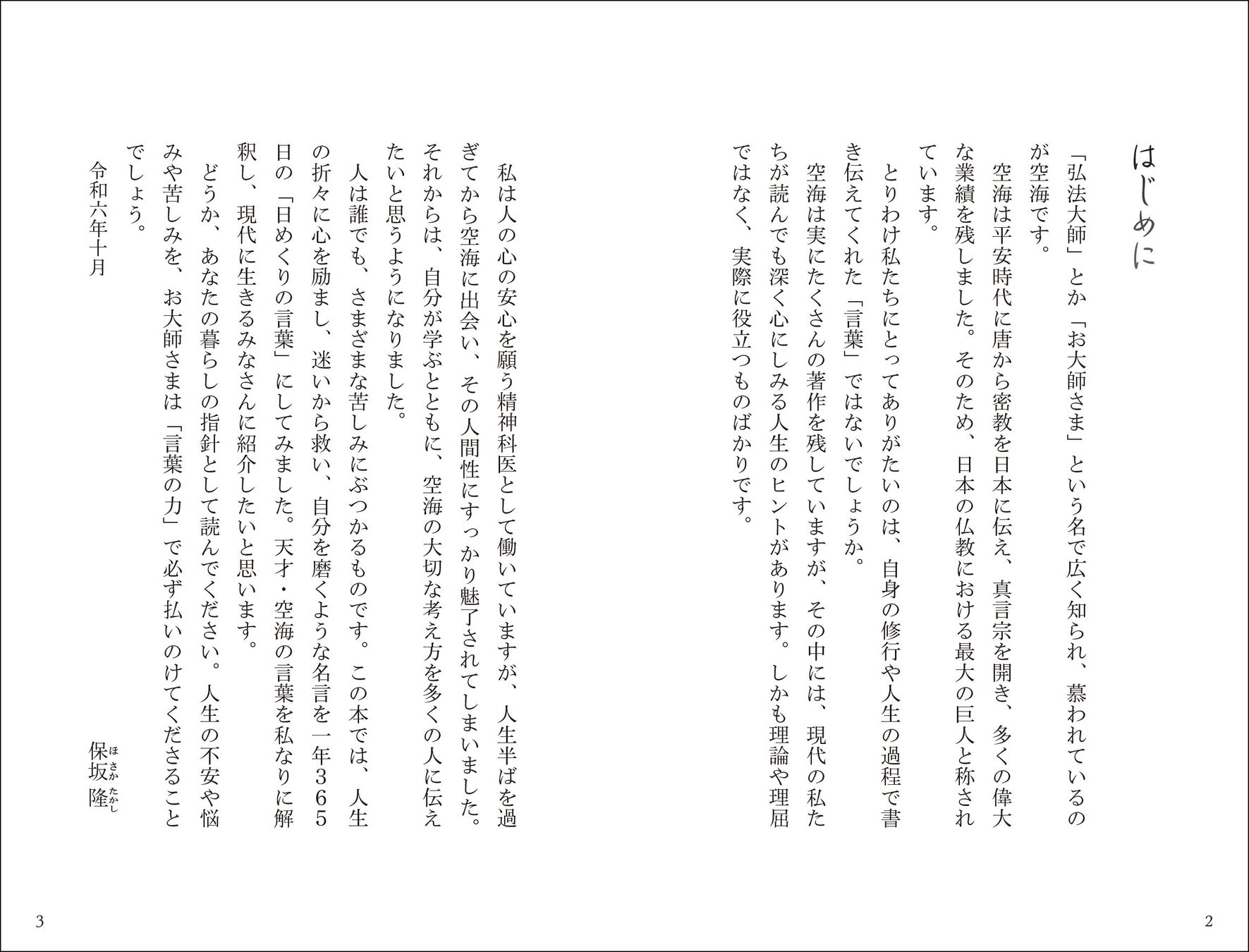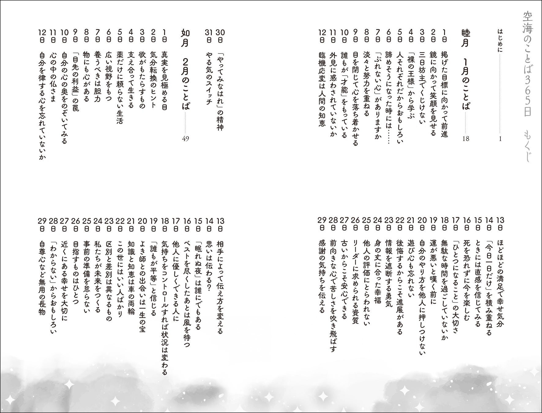 本書は、空海の、慈愛に満ちたことば、遊び心あふれることば、日々の不安が消え去るような優しいことばに焦点を当て、一日一語、365日に分けて紹介します。