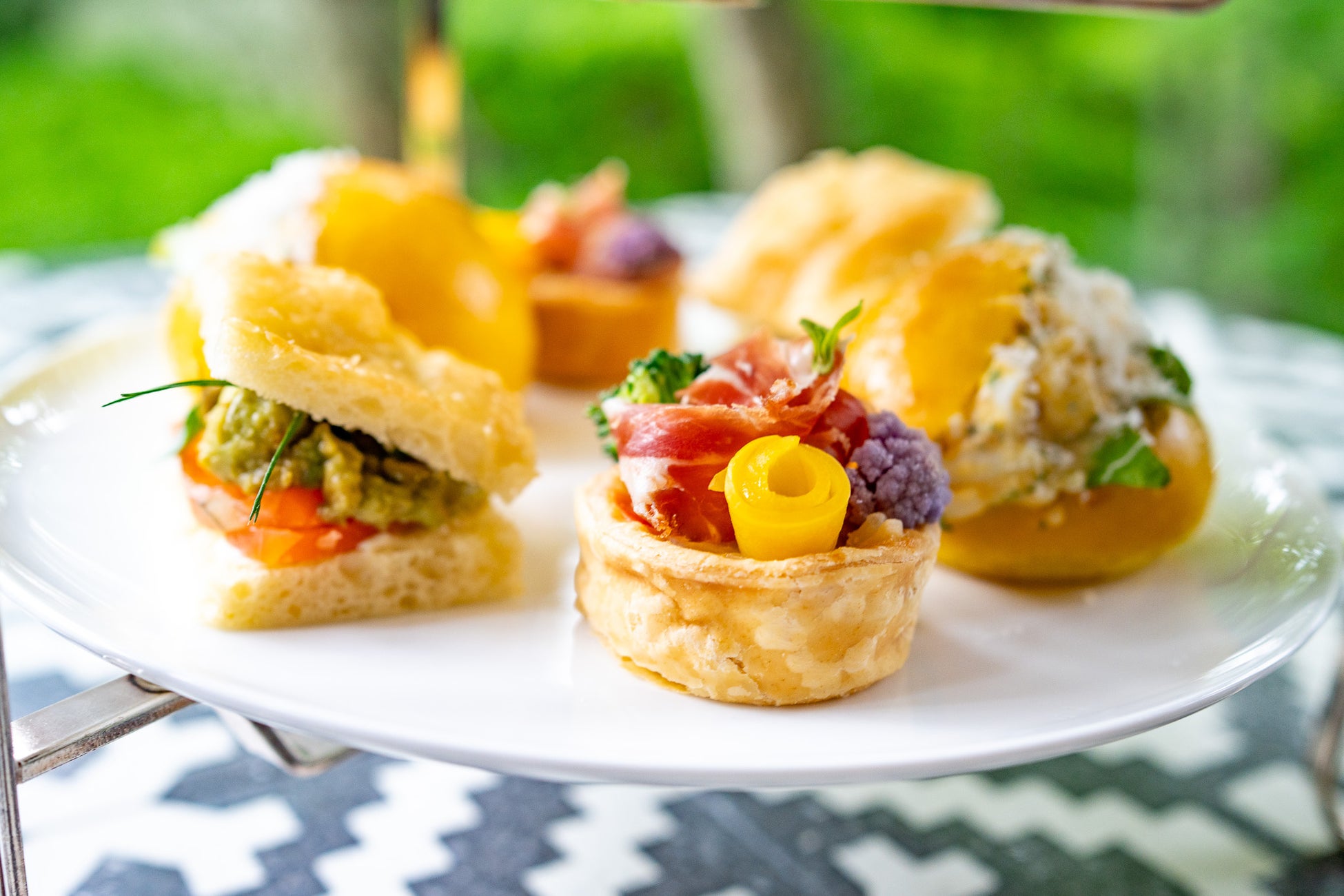 セイボリー…クレソンサラダ、スコーン(季節のフルーツジャムを添えて)、スモークサーモンのフォカッチャサンド、ラタトゥイユのキッシュ、たまごサンドウィッチ