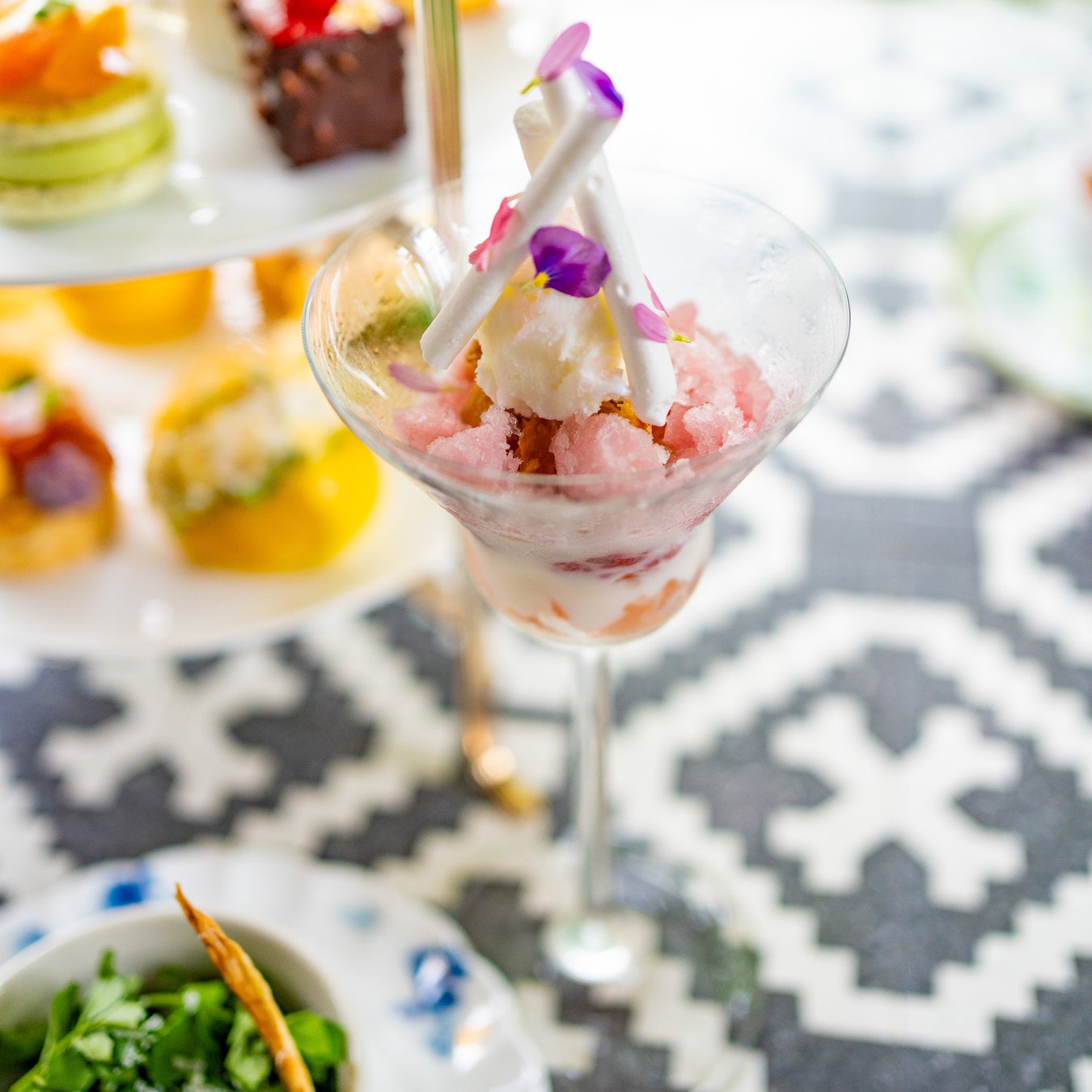 まず登場するのはグラスデザート。暑い夏、まずは涼やかさを感じてほしいというシェフの想いを乗せて、旬のフルーツをいく通りにも調理し、ソースや冷菓などと合わせたさっぱりと軽やかなスイーツから夏のアフタヌーンティーが始まります。
