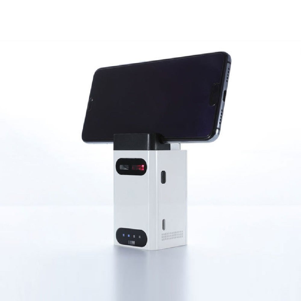 - USB-C充電式、コンパクトに持ち歩けるポータブル設計、スマホを置けるブラケット搭載