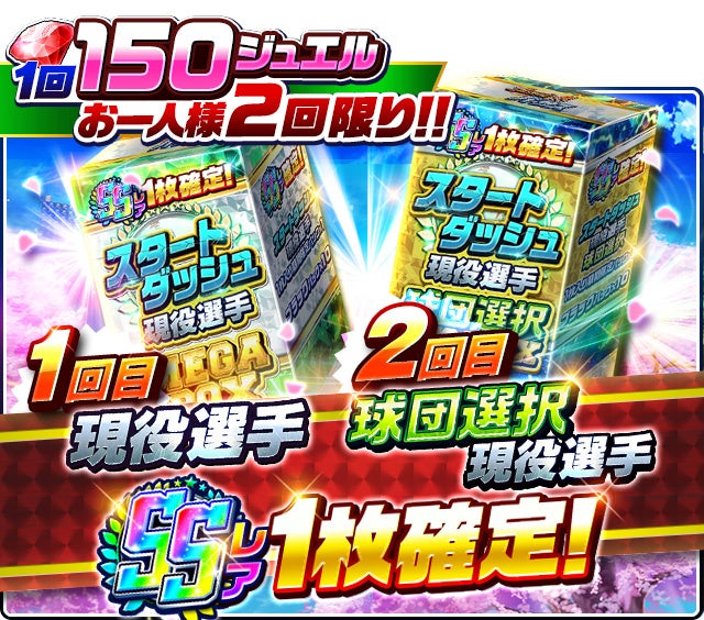 1回150ジュエルでSSレアの現役選手が手に入る「スタートダッシュ MEGA BOX」が登場しました。お一人様2回限りで、2回目は選択した球団のSSレアが必ず獲得できます。