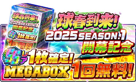 期間中にログインするだけで、SSレア選手が1枚確定で手に入る「球春到来!2025 SEASON.1 開幕記念 SSレア1枚確定!1回無料!MEGA BOX」をGETできます。カード3枚入りパックが10パックと、SSレア確定の1枚入りパックが1パックの、合計31枚のカードが獲得できます。