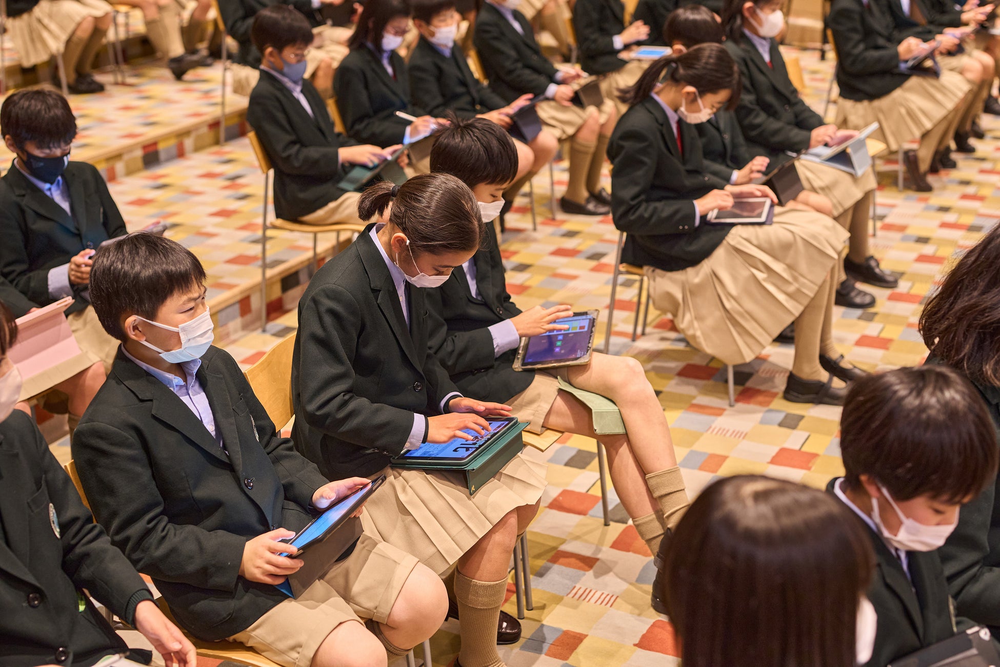 授業は、カーボンニュートラルに関するクイズを鈴木が出題、子どもたちがタブレット端末から回答し、QuizKnockのお二人が解説するという形式で進めました。