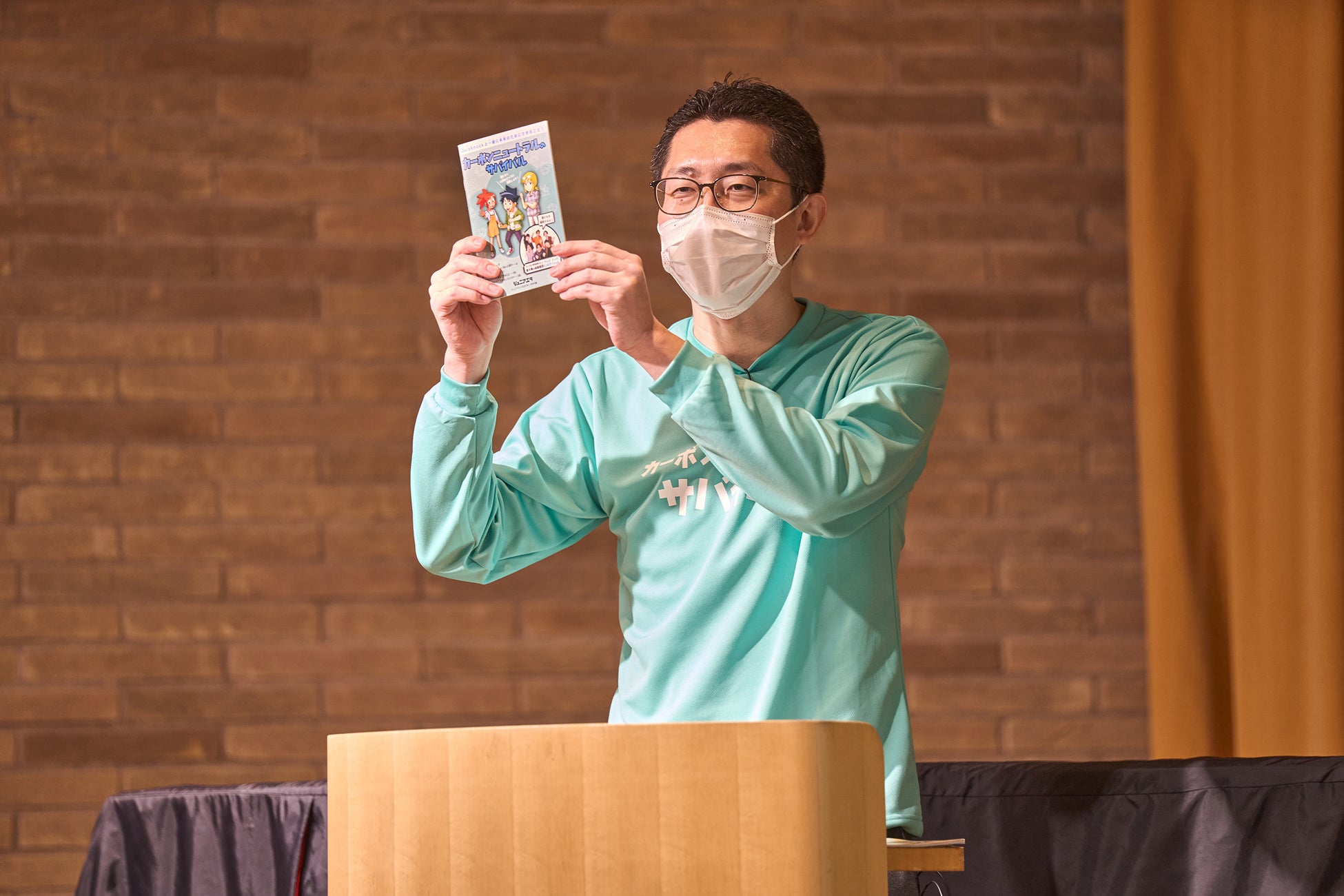 まずはじめに、朝日新聞出版「ジュニアエラ」「AERA with Kids」編集長 鈴木顕が子どもたちに、カーボンニュートラルを学ぶことの意義と、社会全体で取り組むことの重要性を説明し、今回の出張授業を通じて、今からできることを考えてみてほしい、と語りかけました。
