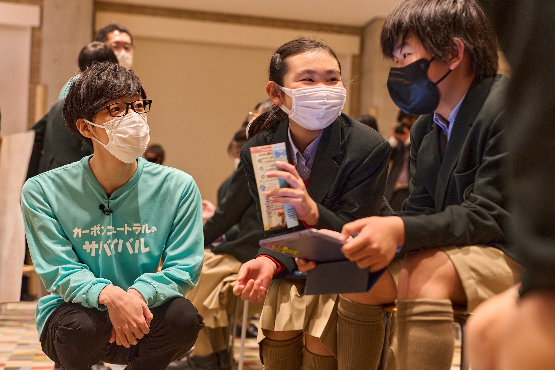 「カーボンニュートラル」の意味を選ぶクイズでは、ほとんどの子どもたちが正解して、QuizKnockの二人を驚かせました。