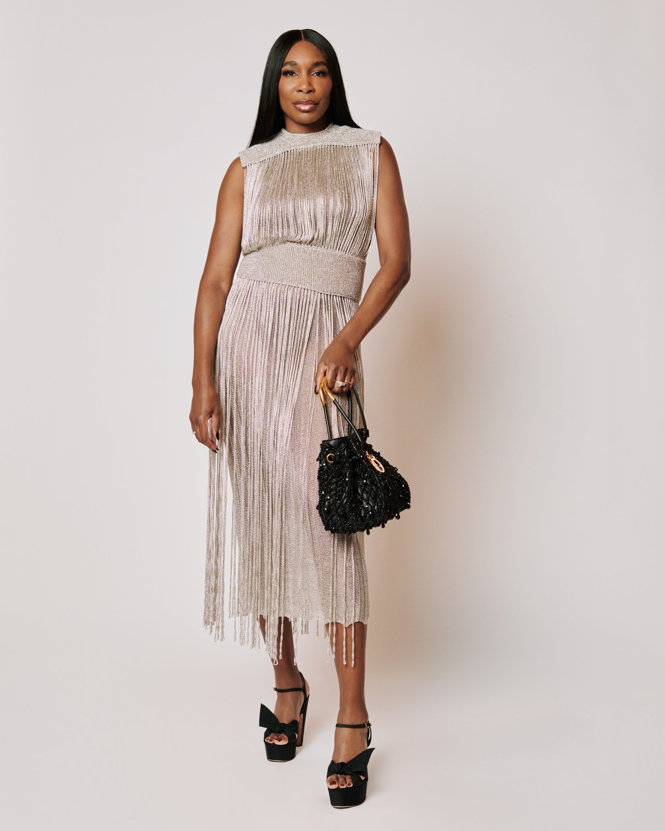 タッセルがあしらわれたきらめくメタリックのドレスを纏ったビーナス・ウィリアムズは、期待に胸を高鳴らせてショー会場へ向かいます。