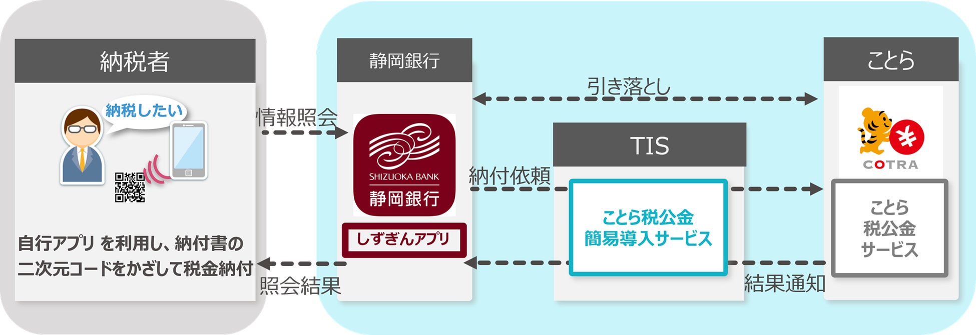 TISインテックグループのTIS株式会社(本社:東京都新宿区、代表取締役社長:岡本 安史、以下:TIS)は、TISの「ことら税公金簡易導入サービス」の株式会社静岡銀行(本社:静岡県静岡市、代表取締役頭取:八木 稔、以下:静岡銀行)への採用が決定したことを発表します。