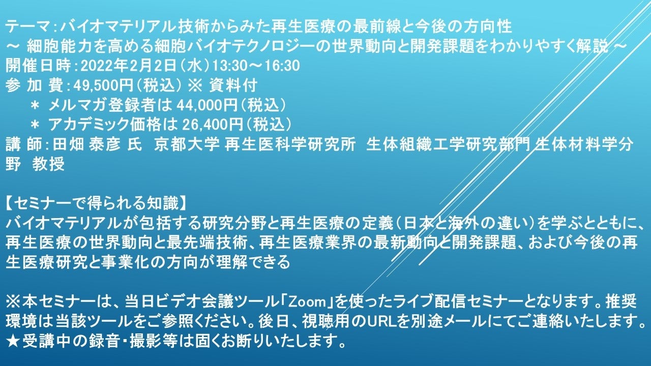 先端技術情報や市場情報を提供している(株)シーエムシー・リサーチ(千代田区神田錦町: https://cmcre.com/ )では、 各種材料・化学品などの市場動向・技術動向のセミナーや書籍発行を行っておりますが、 このたび「バイオマテリアル技術からみた再生医療の最前線と今後の方向性」と題するセミナーを、 講師に田畑 泰彦 氏 京都大学 再生医科学研究所 生体組織工学研究部門 生体材料学分野 教授)をお迎えし、2022年2月2日(水)13:30より、 ZOOMを利用したライブ配信で開催いたします。 受講料は、 一般:49,500円(税込)、 弊社メルマガ会員:44,000円(税込)、 アカデミック価格は26,400円(税込)となっております(資料付)。
