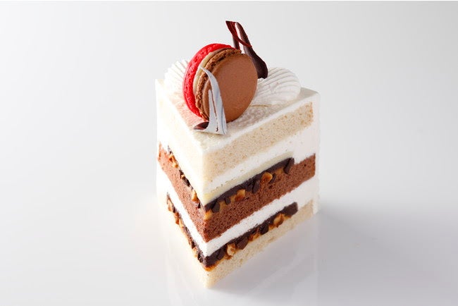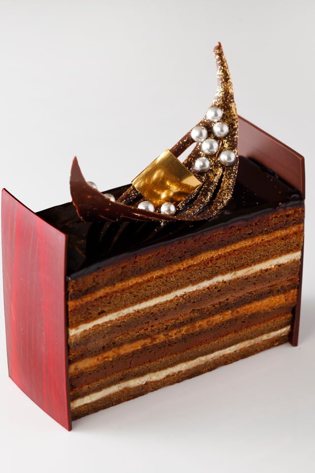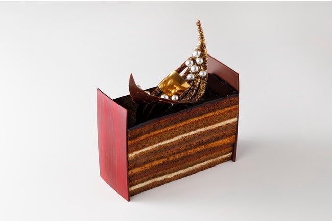 華やかなデコレーションが印象的なチョコレートケーキ。高さ8.5cmのその生地は、14層にも成り、その1層1層には、厚みや食材を変えて極上の味を演出しています。2種類のガナッシュと、2種類のバタークリームを深い味わいのエスプレッソを含ませた7層のビスキュイで挟み、中にはカラメリゼしたアーモンドをアクセントに加えた、至極の逸品です。