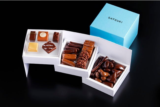 色鮮やかな3段の箱にSATSUKIオリジナルチョコレートとピエール・エルメ・パリのチョコレートが詰まった「SATSUKI CHOCOLATE 3段BOX」が、バレンタイン限定で登場。上段には、香りと程よい苦みの“カフェラテ”をはじめ、優しい味わいが広がる“キャラメル”、渋みのある濃厚な“抹茶”など、5種類のSATSUKIオリジナルチョコレートを詰め合わせました。また、下2段には、カリッとした食感が後を引く美味しさの「ヌガティーヌ」や定番の「アマンド オレ」など人気のピエール・エルメ・パリのチョコレート8種を詰め合わせ、まさにチョコレート尽くしの一箱に。
