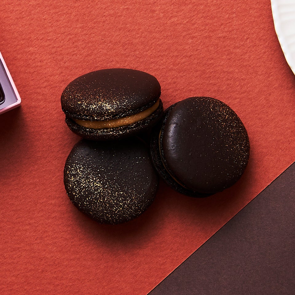 上質なチョコレートを使用した定番の「ビターチョコレートマカロン」に加え、キャラメルクリームに塩のアクセントを加えた「キャラメルセル」、アーモンドを加えた「キャラメルプラリネ」、さらに「キャラメルバニラ」、「ピスタチオ」、「アールグレイ」、「ほうじ茶」の7種のマカロンをお愉しみください。