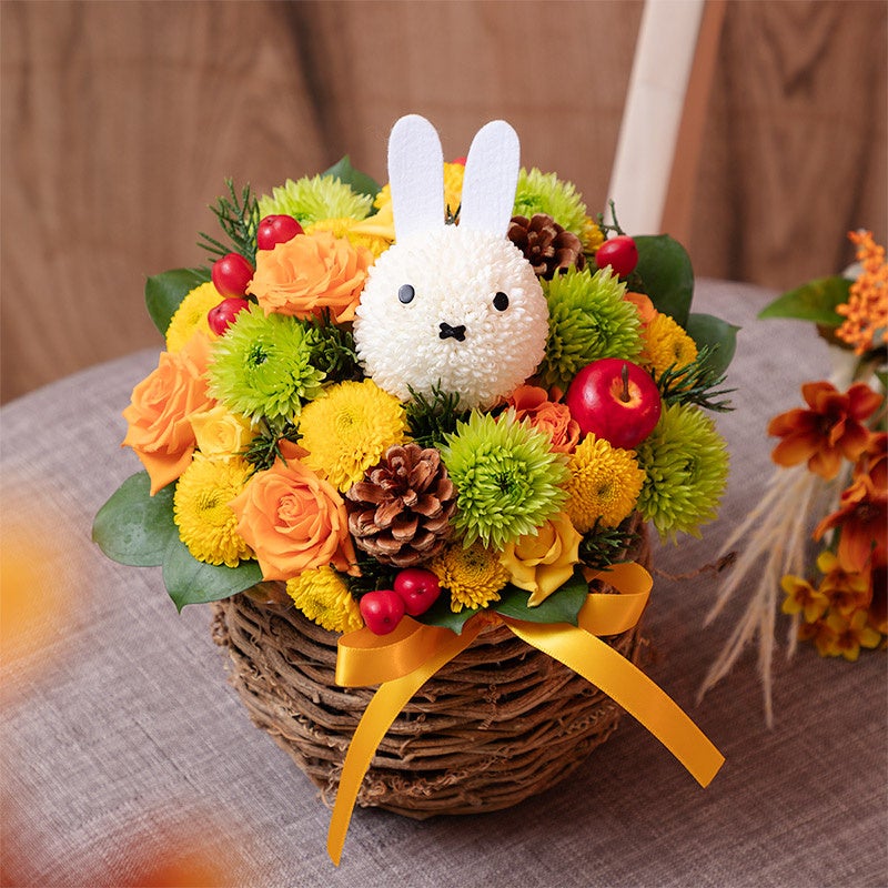 秋らしい色合いでまとめられた華やかなフラワーアレンジメントです。ピンポンマムのミッフィーの周りには、季節ならではのりんごや松ぼっくりがあしらわれ、これから深まっていく秋を演出しています。ご自宅に置いて楽しむのはもちろん、お誕生日や季節のごあいさつなど贈り物にもおすすめです。
