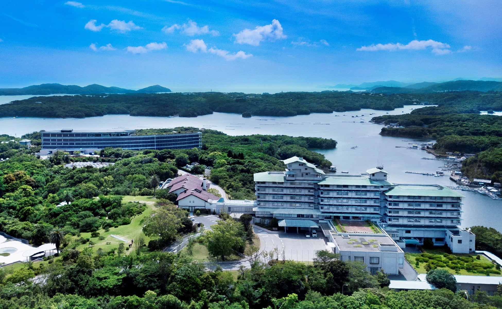 三重県の志摩半島南部、美しいリアス海岸や大小さまざまの島を有し、伊勢志摩国立公園の自然豊かな賢島にあり、穏やかな英虞湾海と深い森に抱かれた大人のラグジュアリーリゾートです。9万平米の広大な敷地と多彩なアクティビティでご滞在を彩るひとときを提供しています。また、両館には4つのレストランとカフェを備え、豊穣の海の恵みと三重の美食をお楽しみいただけます。英虞湾に沈む夕景は、リアス海岸に浮かぶ島々、名産でもある真珠養殖の筏が織り成すシルエットが神秘的な光景。その豊かな自然が「日本の原風景」とも称された、ここにしかない緩やかな時の流れをお過ごしください。