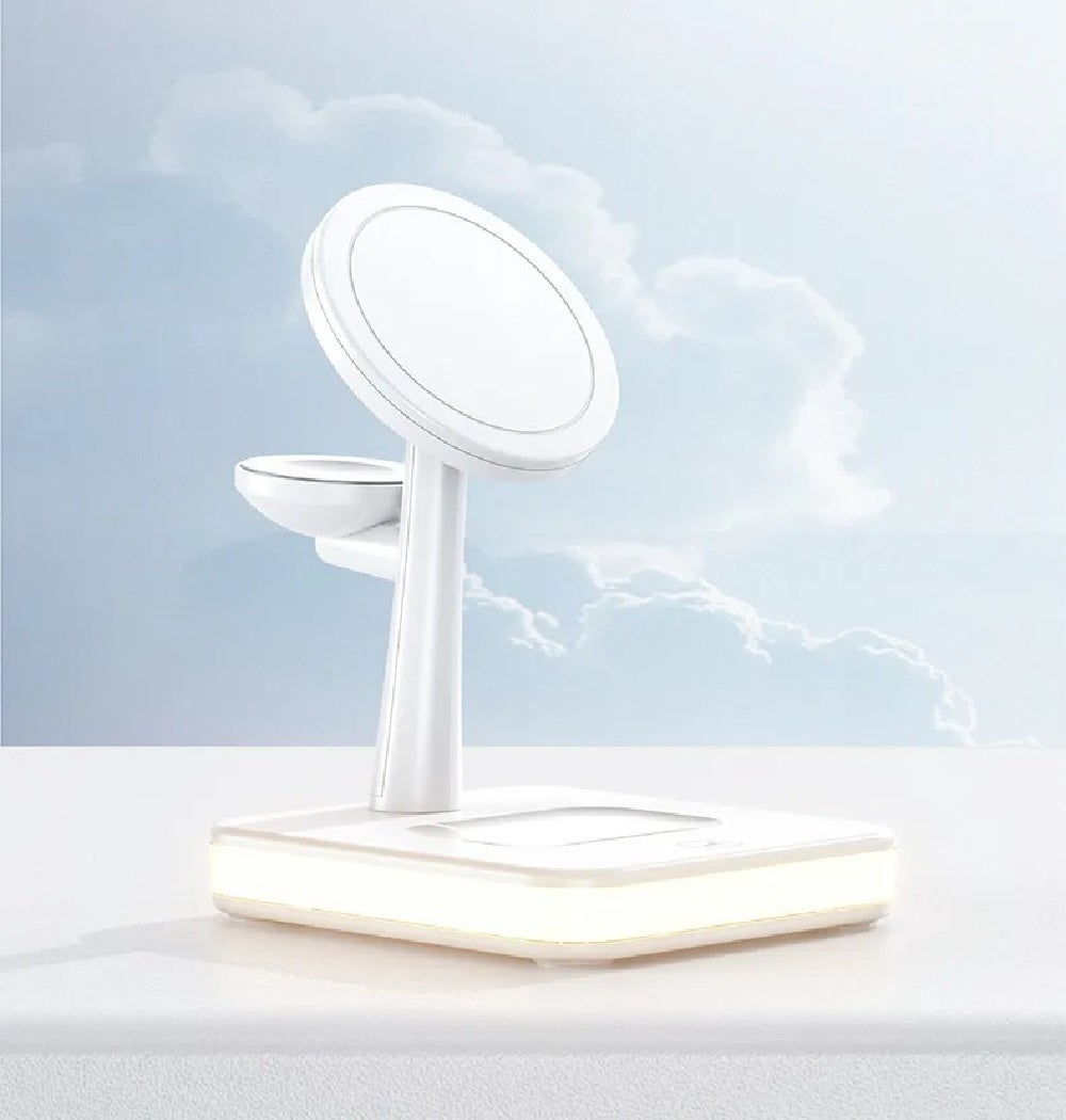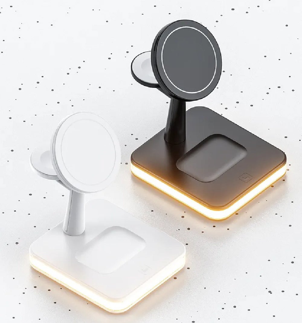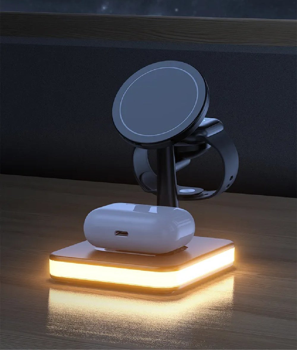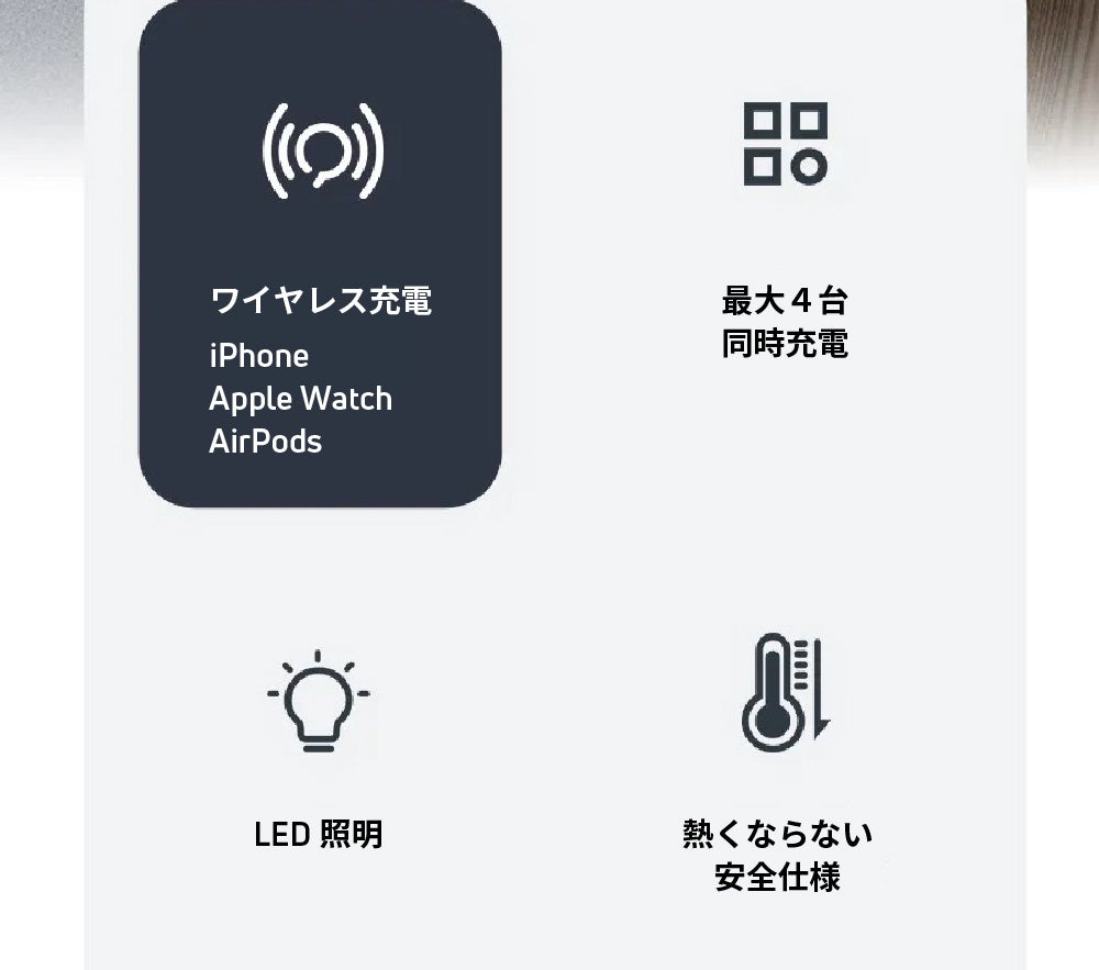 - 身につけているiPhone・Apple Watch・AirPods+1台 合計4デバイス充電とインテリア照明としても デスクや寝室に置いてスマートに