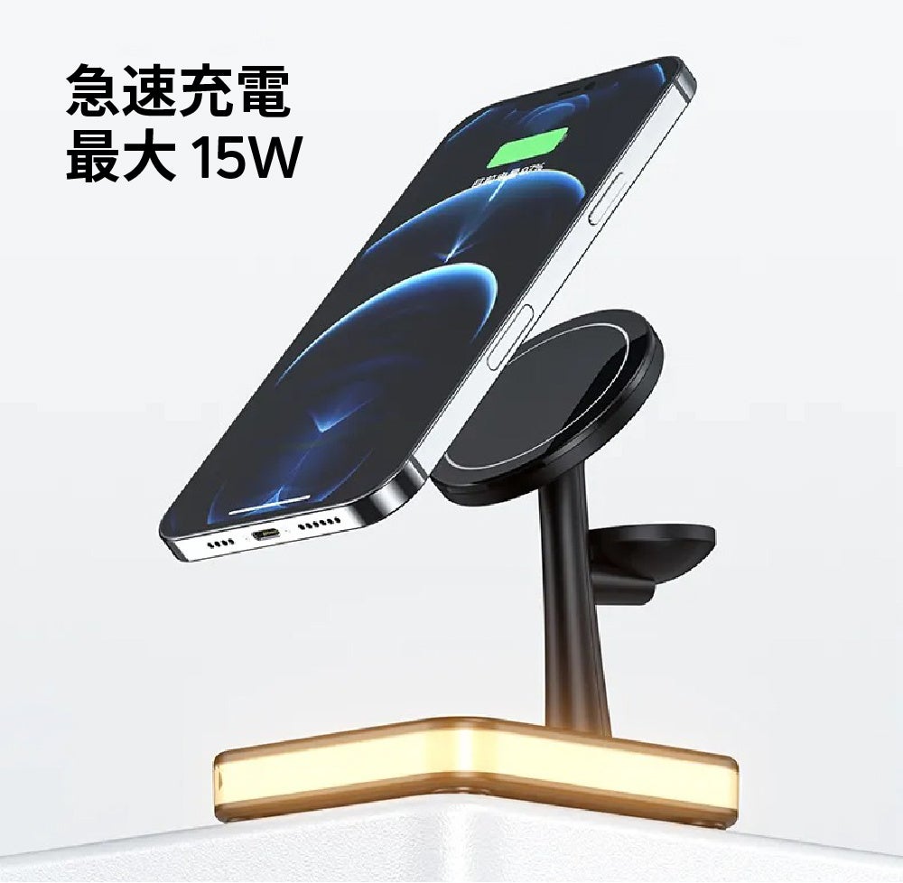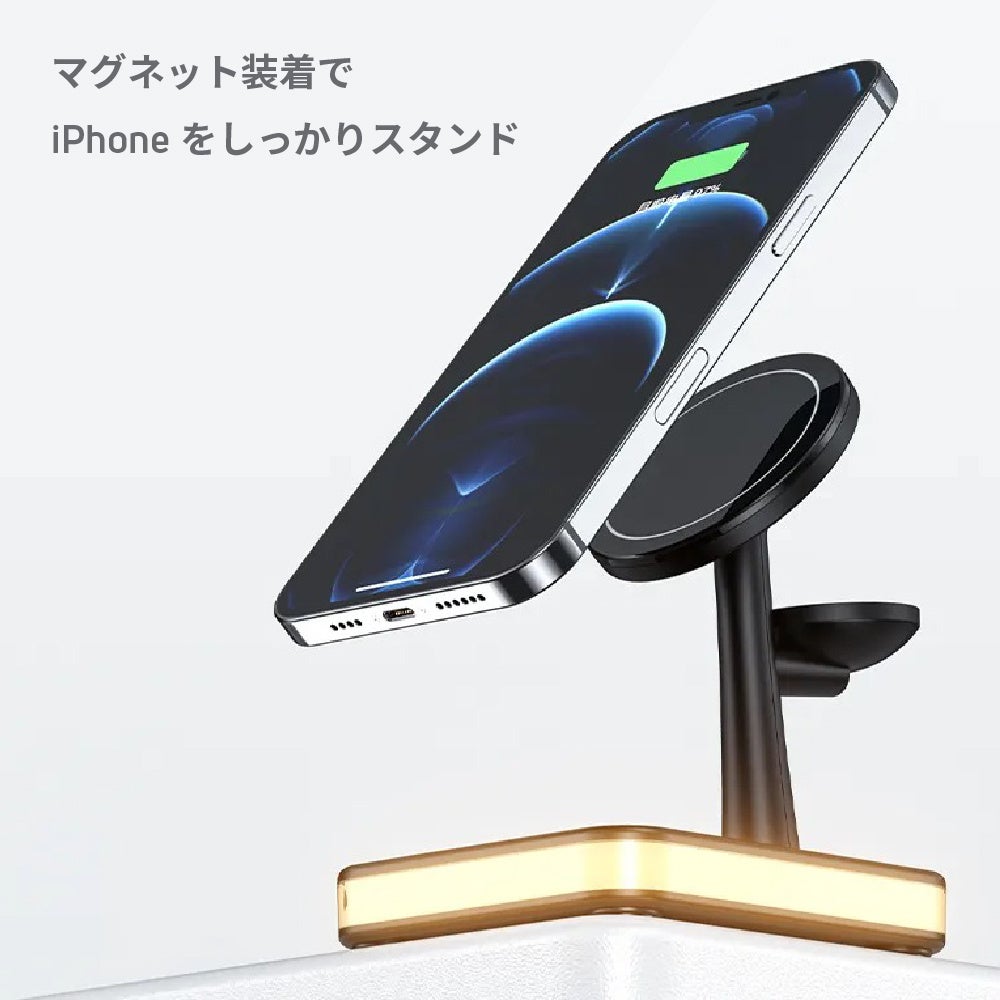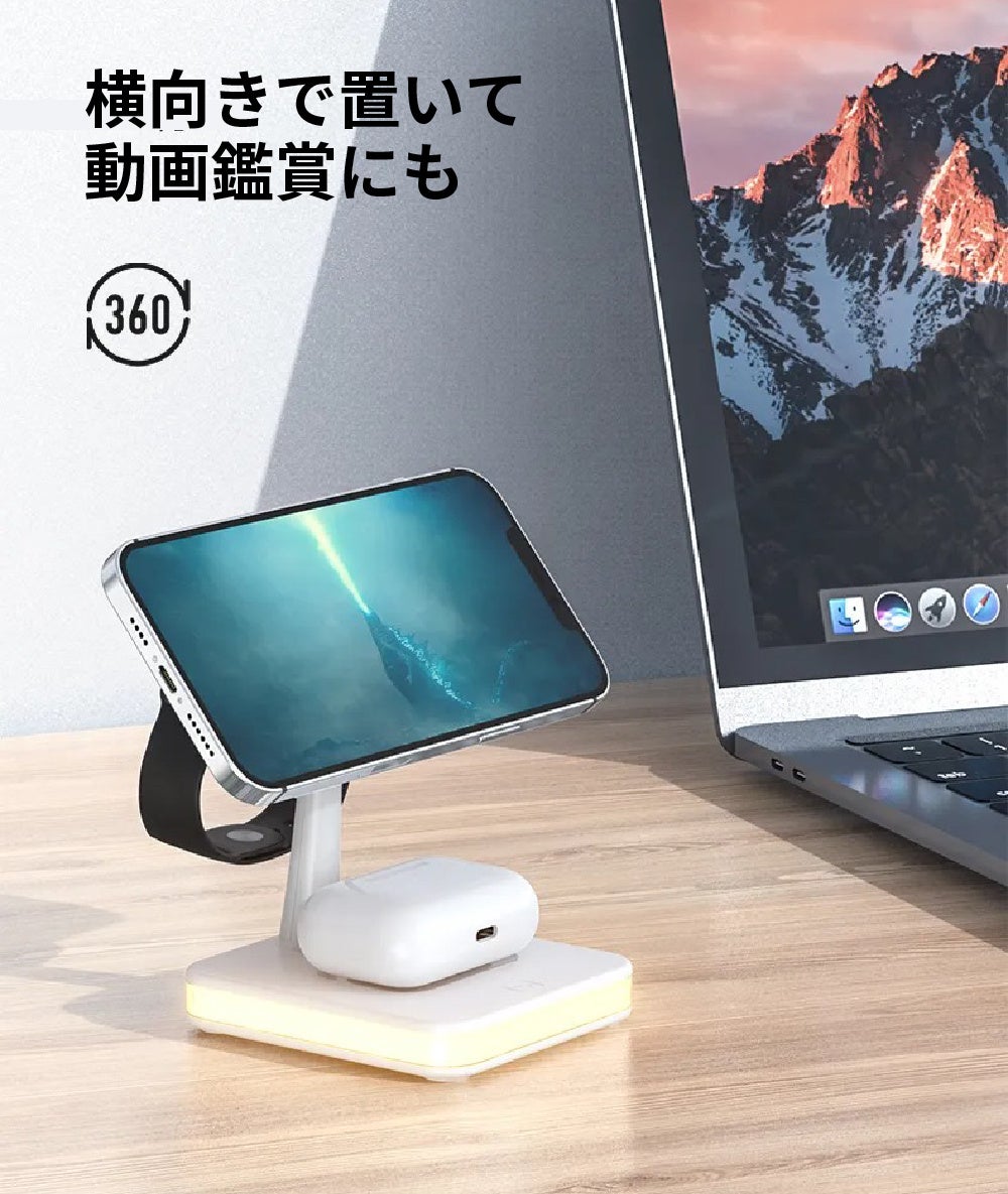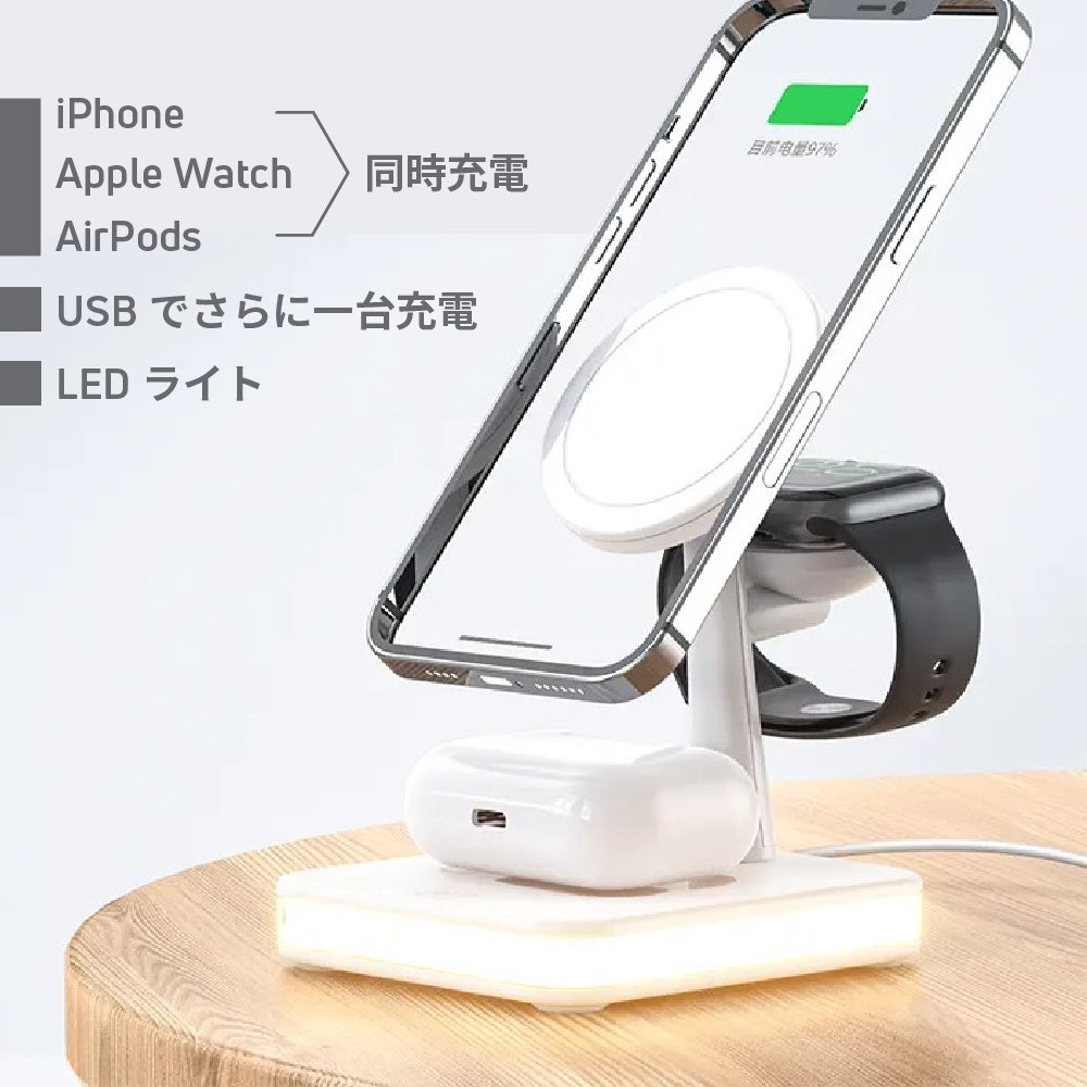 ●iPhone・Apple Watch・AirPods用ワイヤレス充電、USB接続でもう一台デバイスを充電可能、LED照明付き多機能充電スタンド