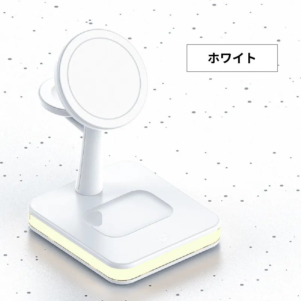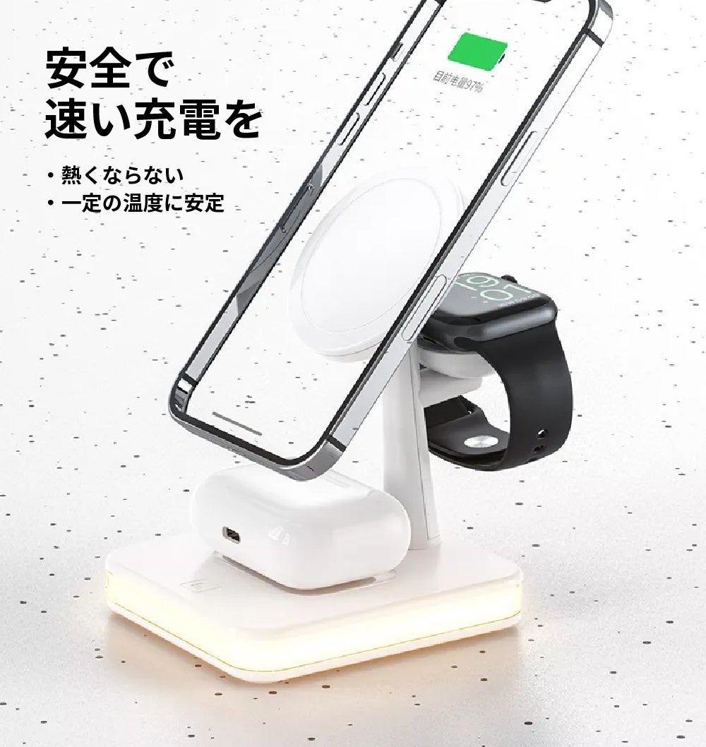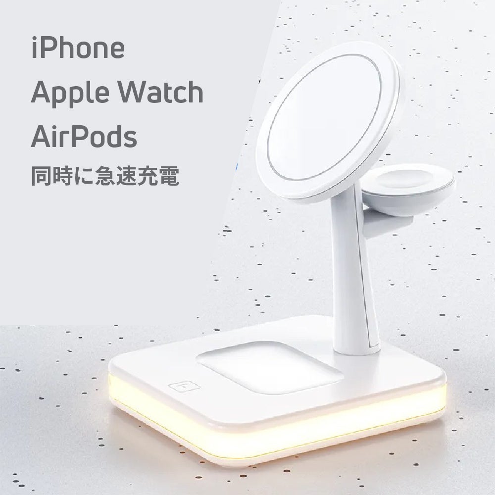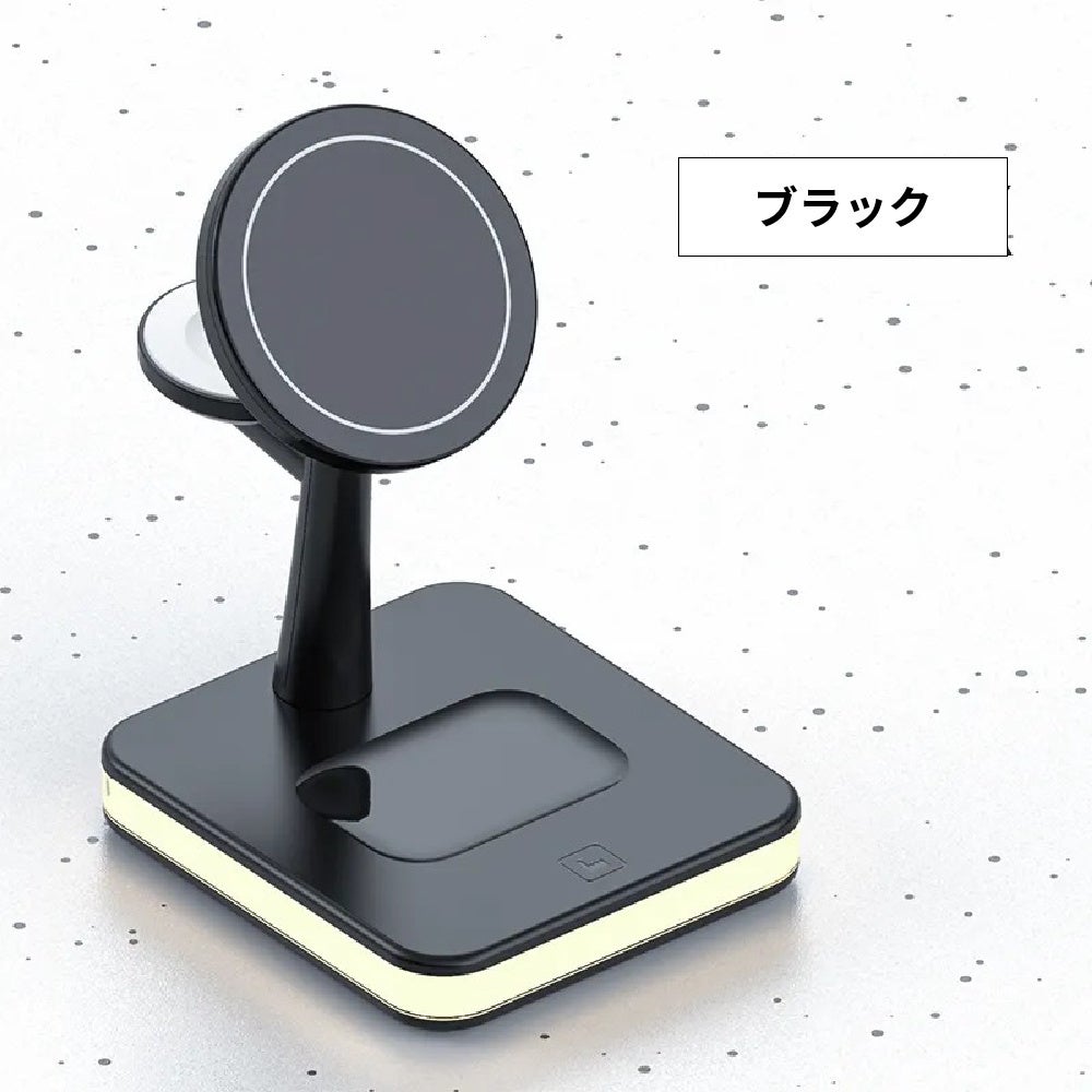 ●iPhone・Apple Watch・AirPods用ワイヤレス充電、USB接続でもう一台デバイスを充電可能、LED照明付き多機能充電スタンド