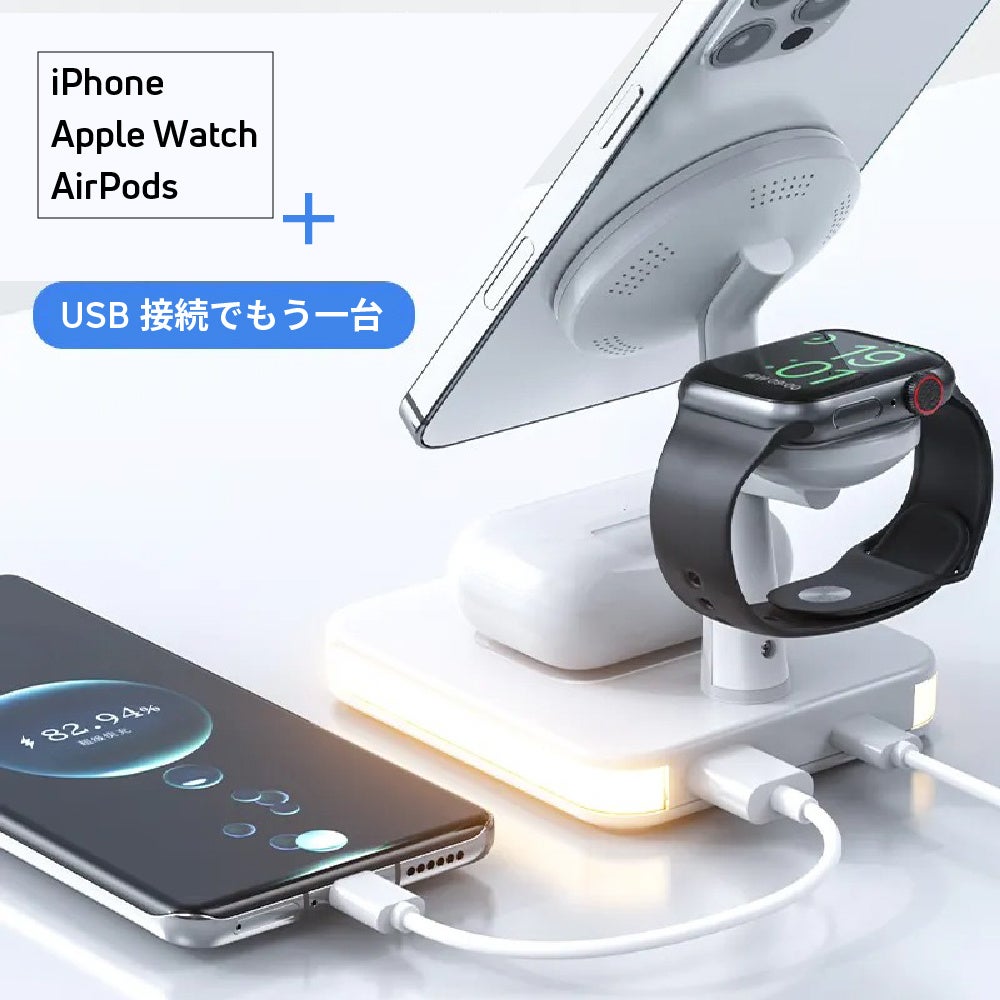 - iPhone・Apple Watch・AirPods用ワイヤレス充電、USB接続でもう一台デバイスを充電可能、LED照明付き多機能充電スタンド