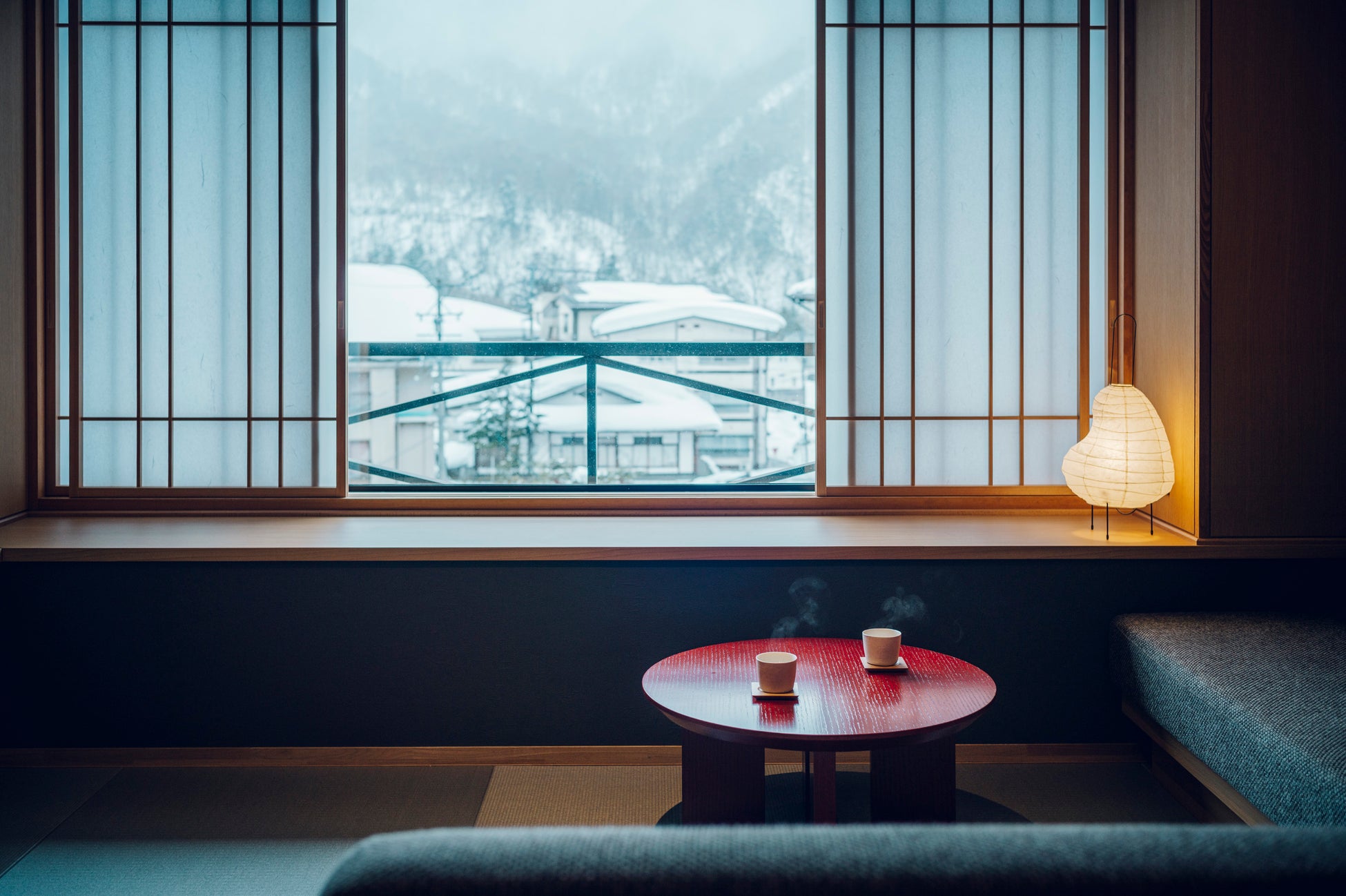 飛騨地方の豪雪地帯では、雪を落としやすくするために屋根を急傾斜にした「合掌造り」の住まいが昔から使われてきました。界 奥飛騨では、その合掌造りに着想を得た照明「飛騨玉」を集落に見立てて中庭に配置。界 奥飛騨の中庭は、かつて公衆浴場があり人々が行き交っていた「辻空間」の中心にあります。人々が集い、屋根の葺き替えなどを助け合う合掌造り集落の文化と、人が集い交わる辻空間の記憶を重ね、飛騨玉の明かりが中庭を照らします。