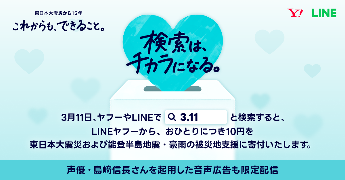 LINEヤフー株式会社(以下、LINEヤフー)は3月11日に、「Yahoo! JAPAN」や「LINE」で「3.11」と検索したユーザーひとりにつき10円を、東日本大震災および能登半島地震・豪雨の被災地支援に取り組む団体へLINEヤフーが寄付する「3.11 検索は、チカラになる。」を実施します。今年は、3月9日から3月11日までの3日間限定で宮城県出身の声優・島﨑信長さんを起用した音声広告を配信します。